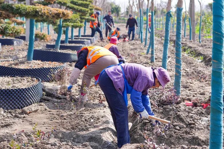 走进兴园村“兴农苗木基地”,满眼绿意扑面而来,田间地头一派热火朝天的繁忙景象。在村公益服务社的统一组织下,村内不少富余劳动力齐聚于此,投身苗木管护工作。大家分工协作,挖坑、放苗、浇水,一株株新苗顺利“安家落户”。