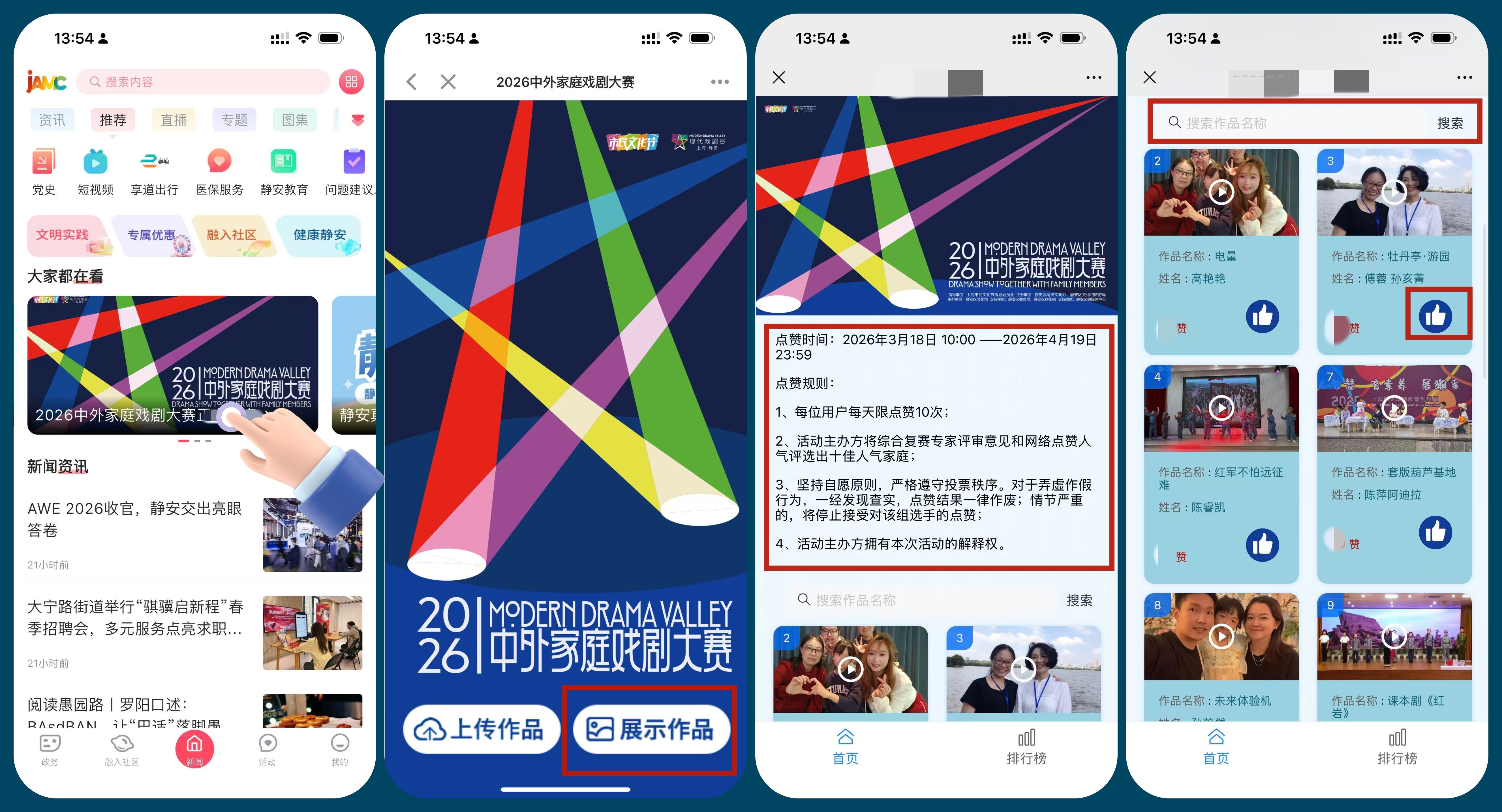 2. 首页直达“2026中外家庭戏剧大赛”活动专题入口,进入页面后,可浏览晋级作品,也可通过搜索栏输入作品名称。点击作品下方“点赞”按钮,即可完成助力!
