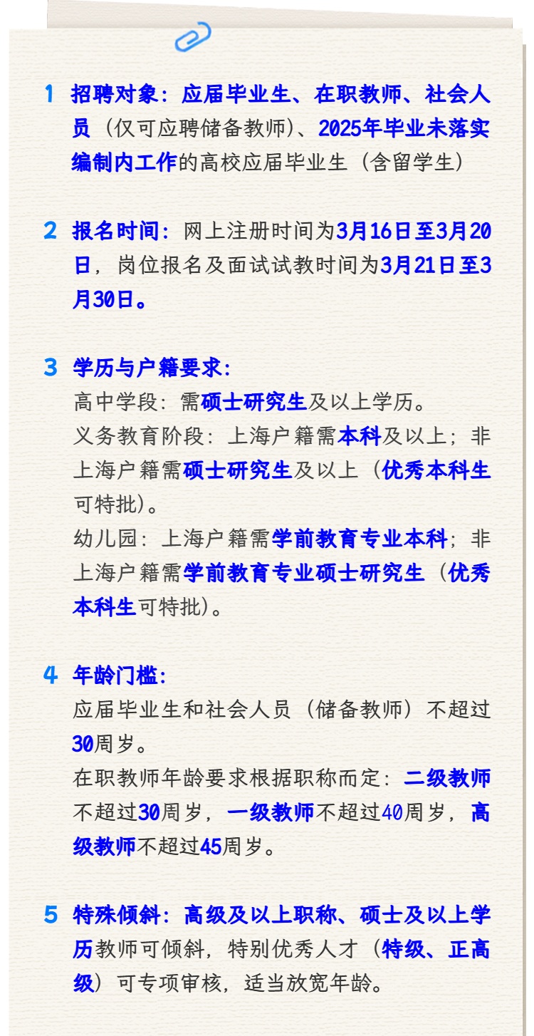 备注:根据《上海市人力资源和社会保障局等五部门关于优化调整高校毕业生参加本市招考(聘)工作有关事项的通知》(沪人社就〔2024〕309号)文件精神,本次招聘一并向毕业证书落款为2025年、未落实编制内工作的高校应届毕业生(含留学生)开放。若上级有新规定,从其规定。