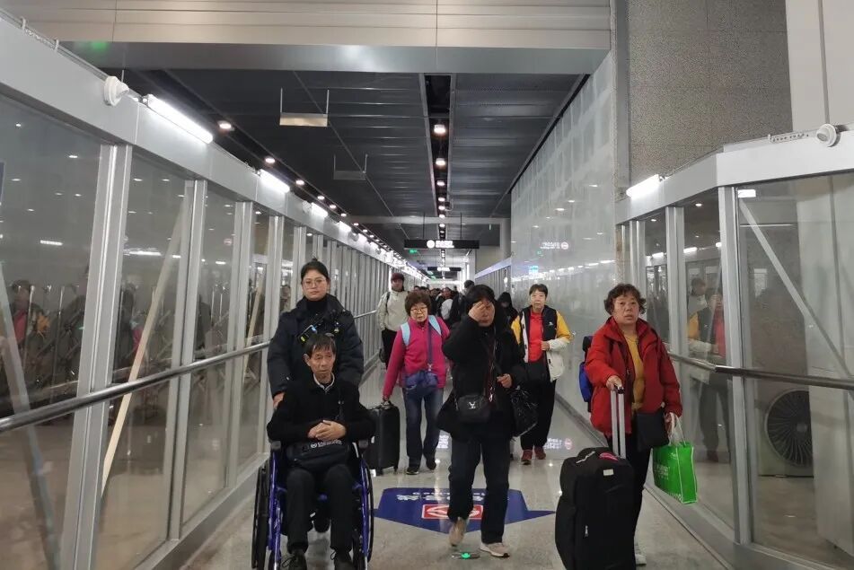 腿脚不便的旅客李先生乘火车到站后,列车工作人员提前与枢纽管理服务中心工作人员对接,李先生从高铁下车开始,就有工作人员推他坐上轮椅,通过无障碍坡道、电梯,一直送他到地铁进站口,再由地铁工作人员接力送进车厢。“一路有人护送,很感动。”李先生表示。