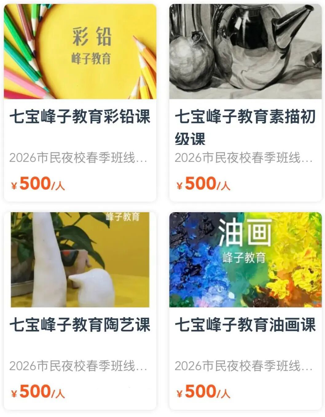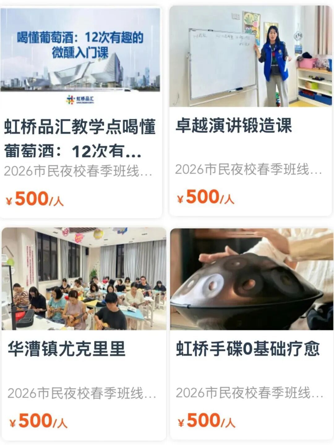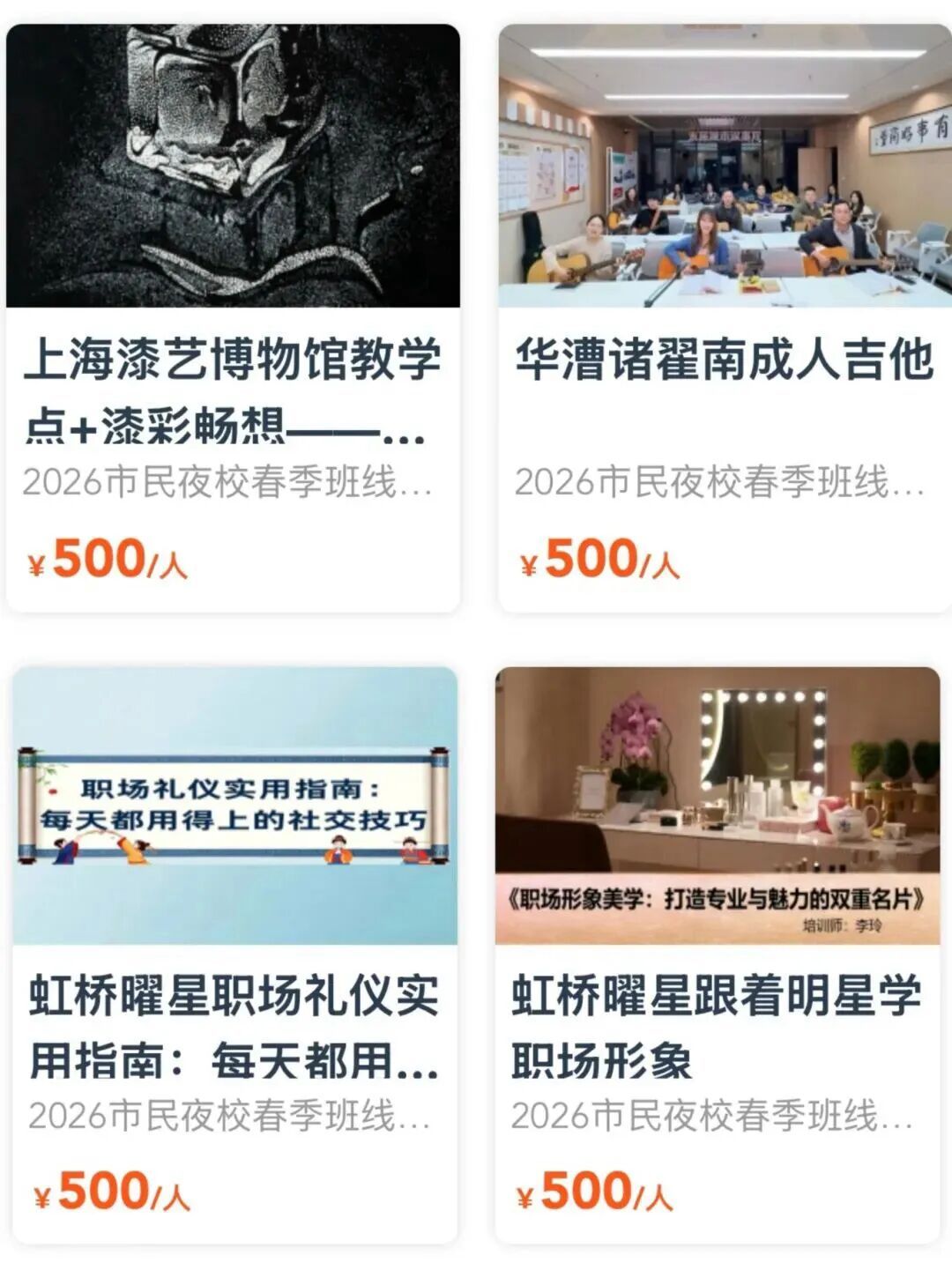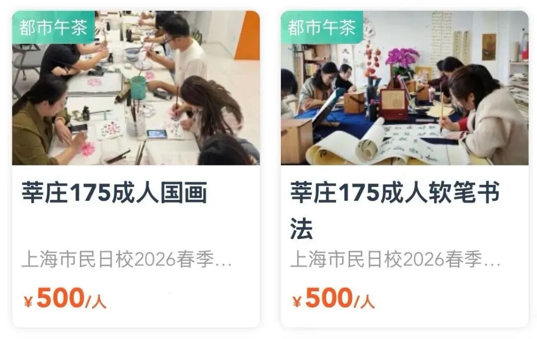 2026市民艺术夜校春季班 2026市民日校春季班 喜欢就要抓紧啦 捡漏! 错过不再有 夜校与日校 最后几天 “捡漏”的机会 就等你了! 上海市民艺术夜校春季班、 上海市民日校春季班的 火爆课程一抢而空, 没抢到课程的市民朋友们, 又急了…… 3月20日17点报名截止, 快来赶上这一波捡漏! 与你喜爱的课程相约, 徜徉艺术的世界吧! 闵行区课程速览(夜校)