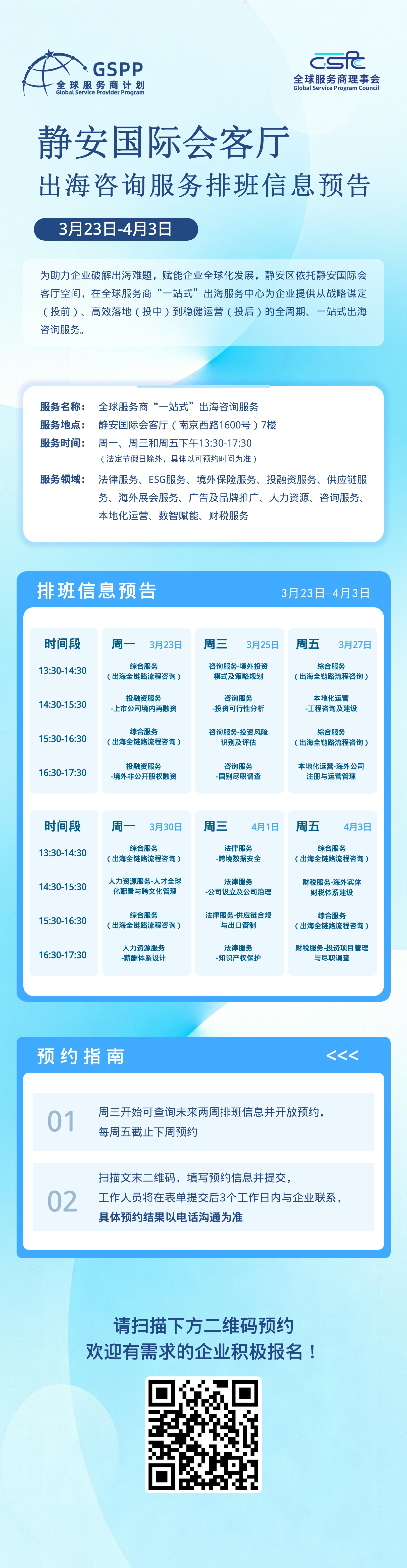 静安国际会客厅出海咨询服务排班信息预告(3月23日—4月3日)详见: