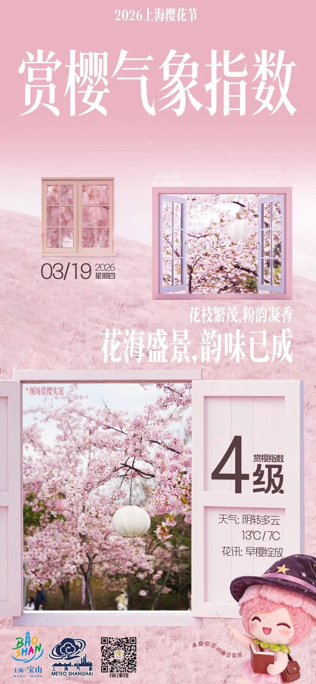 穿衣以舒适春装为主;夜樱观赏时园区温度稍降,请注意防寒保暖。
