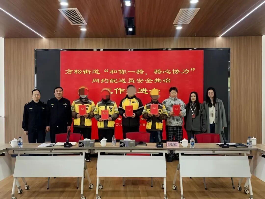 方松市场监督管理所所长李刚与方松街道第二街区党支部书记吴亚夷共同为5名受聘骑手颁发“网络餐饮与特种设备双安全监督员”聘书。一纸聘书,承载的不仅是荣誉,更是沉甸甸的责任,也标志着方松街道网约配送员正式加入食品安全与特种设备安全社会共治阵营,“和你一骑,骑心协力”共治品牌正式落地生根。