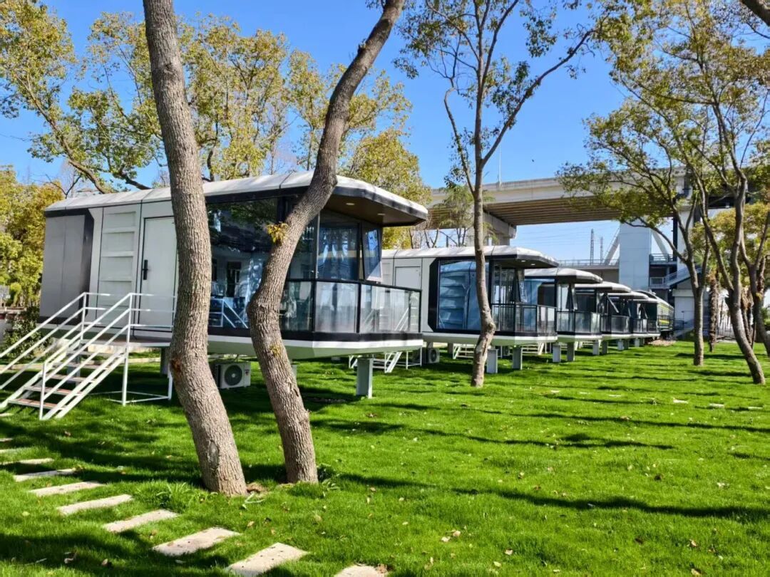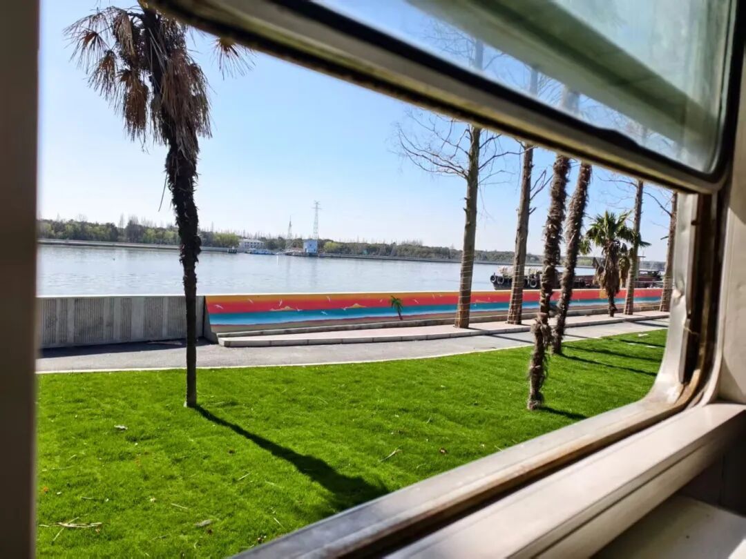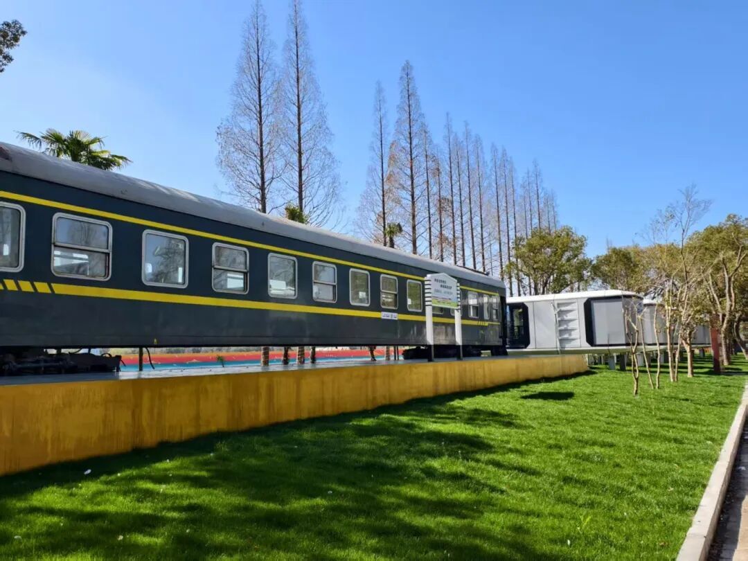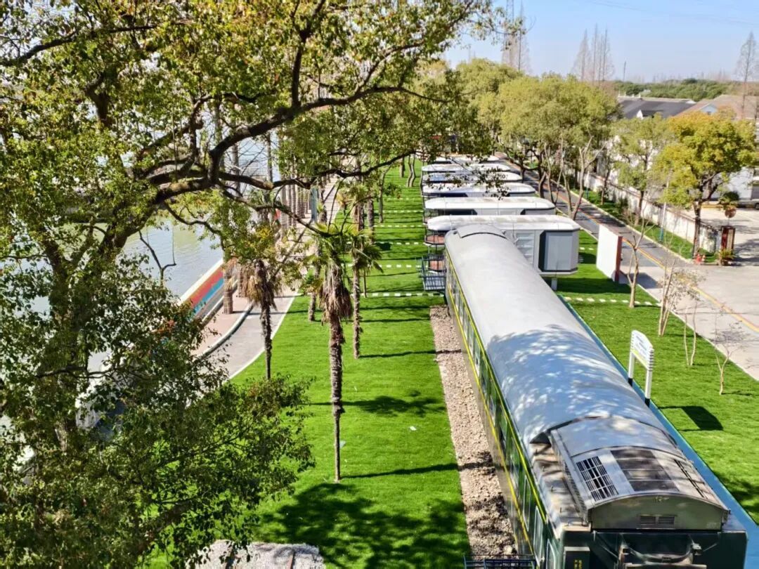 这里没有喧嚣,只有柔软的草坪、成排的绿树、蜿蜒的步道,和一节停靠在江畔的老式绿皮火车车厢。