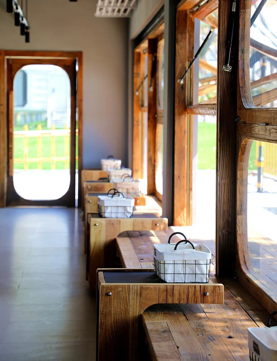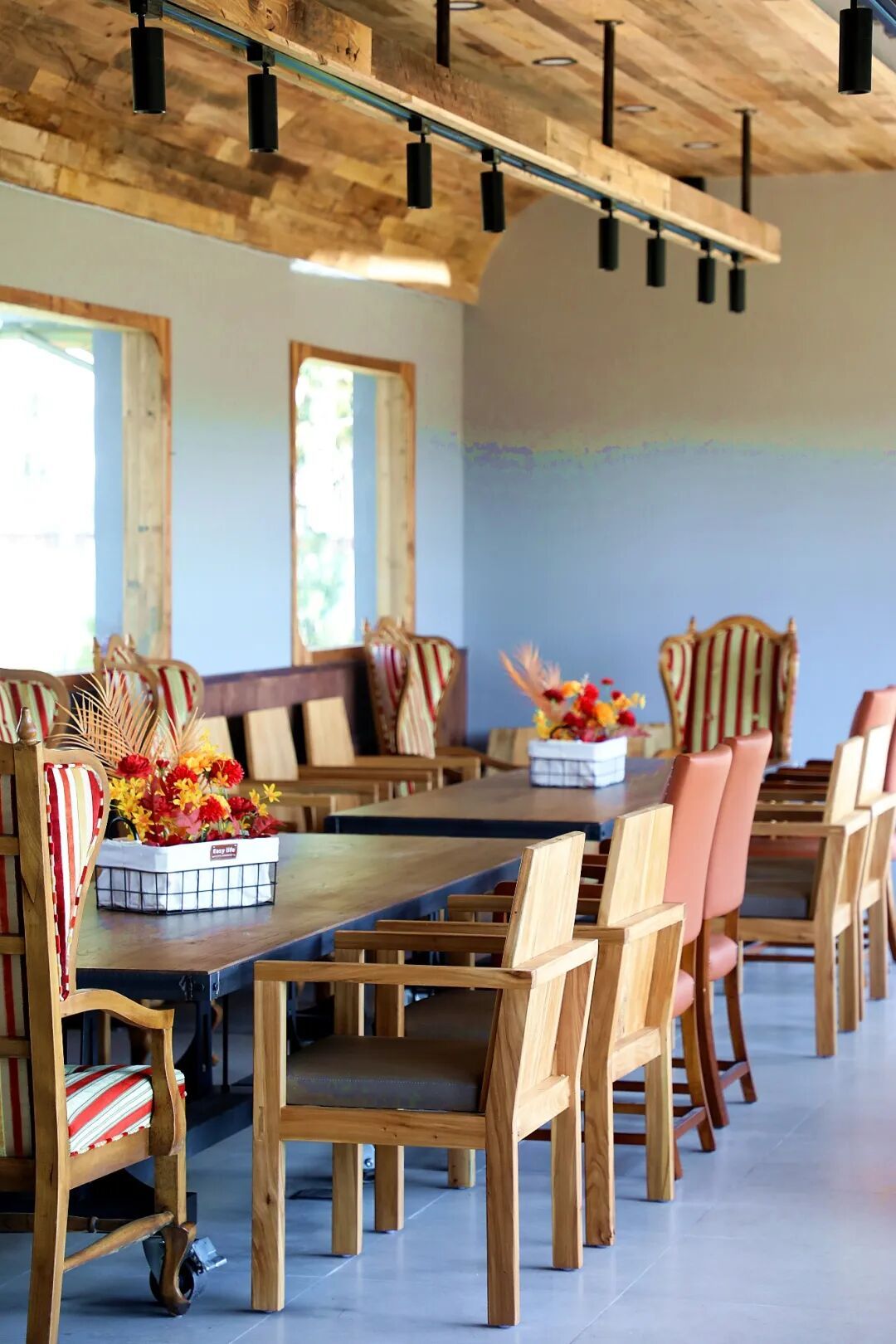 旧木色的天花板、窗框与桌椅带着自然的纹理,像被时光摩挲过的老物件,大面的木框窗户把天光和绿意引了进来,窗外的草地与栏杆在玻璃上投下细碎光影,室内的花艺点缀着红与暖黄,让空间既有质朴的松弛感,又藏着精致的烟火气。