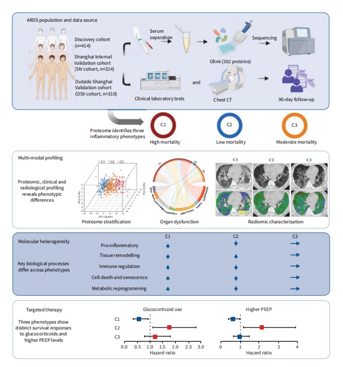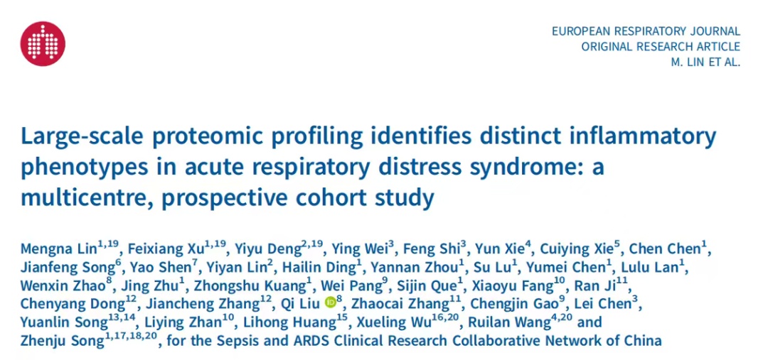 近期,复旦大学附属中山医院宋振举教授团队牵头并联合全国11家知名医疗机构开展的多中心、前瞻性队列研究,在行业国际权威期刊《EUROPEAN RESPIRATORY JOURNAL》(欧洲呼吸杂志,IF 21.2)发表了题为“Large-scale proteomic profiling identifies distinct inflammatory phenotypes in acute respiratory distress syndrome: a multicentre, prospective cohort study”的研究论文。团队首次精准识别并提出 ARDS 三种炎症表型,为该疾病的精准诊疗提供全新分型依据,彰显了中国团队在急危重症领域的研究实力。