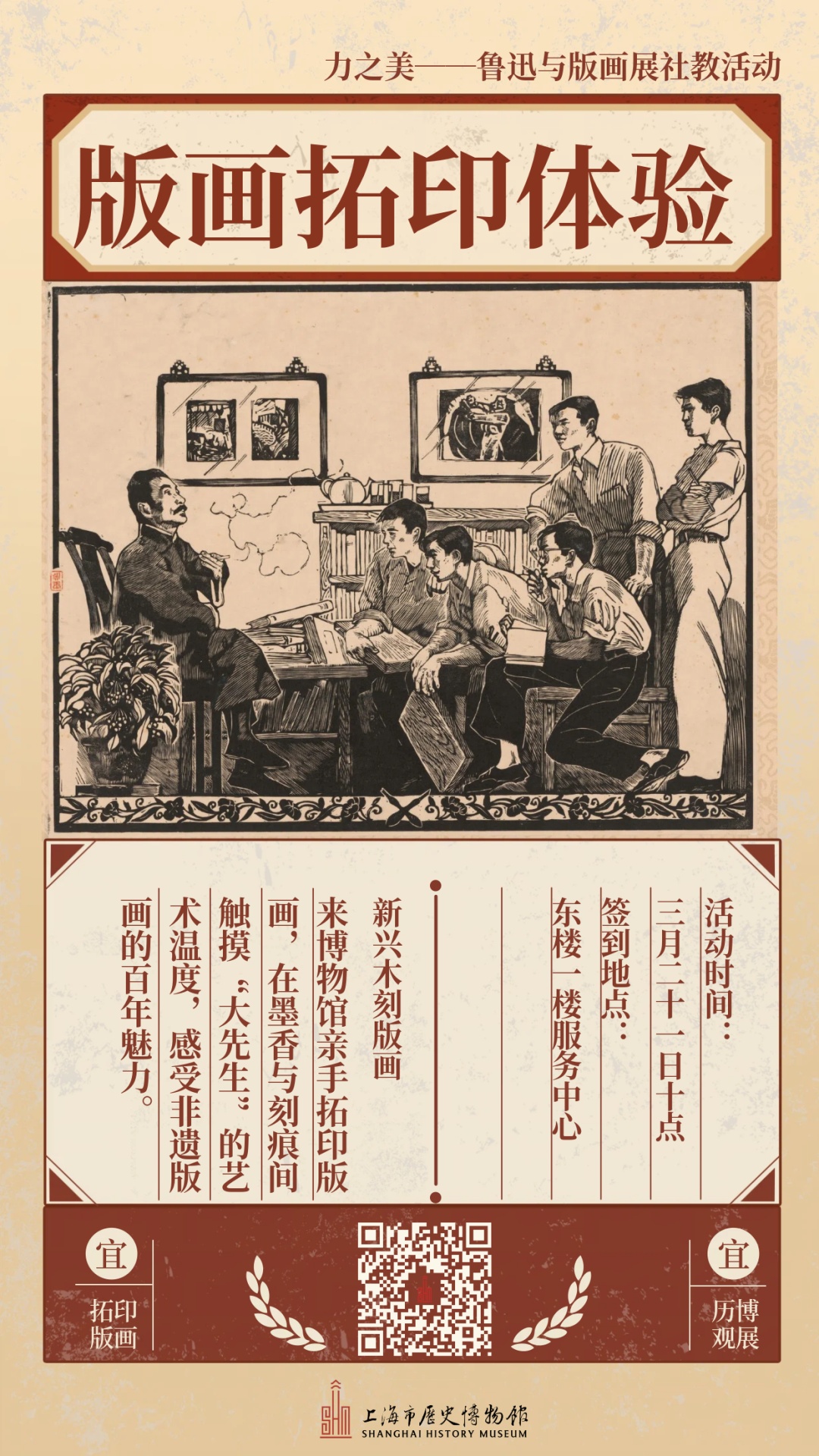 本次版画拓印体验活动将携手北京鲁迅博物馆(北京新文化运动纪念馆),于3月21日上午与“力之美——鲁迅与版画”展览同步开启。届时,馆方社会教育部王钰老师将带领观众通过亲手拓印版画,对现代木刻版画创作过程有基本的了解;在博物馆中零距离感受“大先生”与版画艺术的魅力,沉浸式感受非遗文化之美。