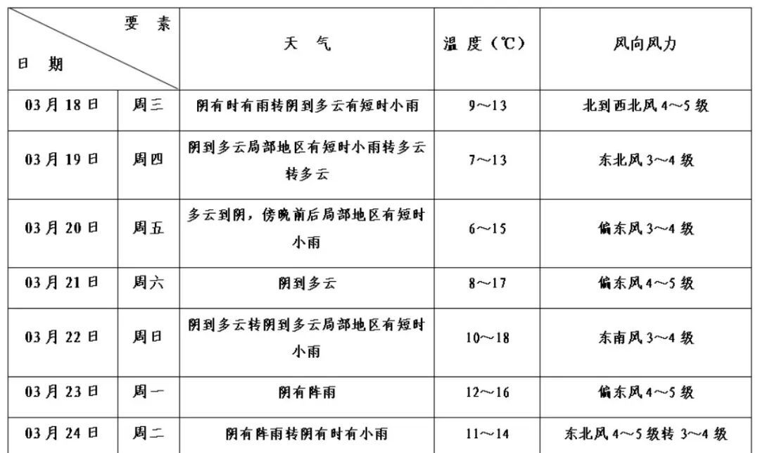 今天半夜雨止转为阴到多云,风力也随之减弱。明天早晨的气温不高,预计在7℃附近,白天最高气温13℃。东北风3~4级。相对湿度90%—55%。明天云系仍然较多,阳光虽有露脸机会,但湿度大,还是不太适宜洗晒。