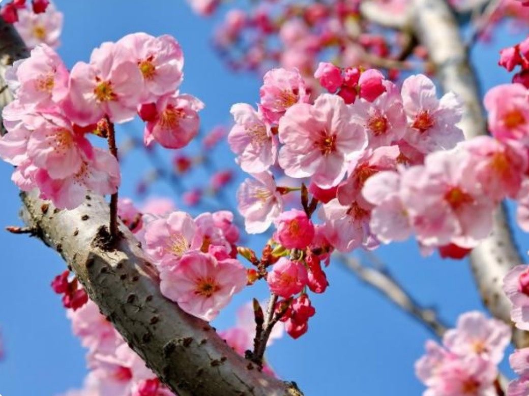 中樱品种,花大色艳,花色呈迷人的绯红色。花期与染井吉野樱相近,但颜色更为浓烈,观赏效果极佳。
