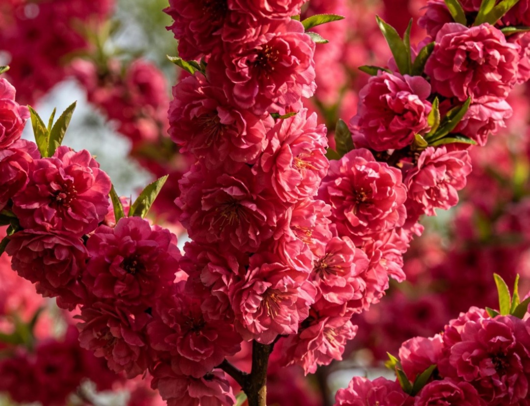 关山樱是经典的晚樱品种,花朵硕大且为重瓣,花色浓郁呈深粉红色,花瓣层层叠叠极为华丽。它是花叶同放品种,紫红色新叶与粉色花朵相映成趣。
