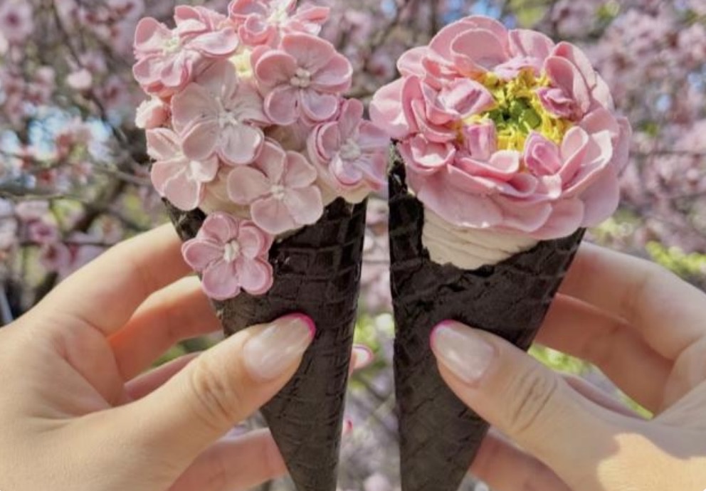 粉嫩的樱花风味冰淇淋,顶部点缀着樱花花瓣,是春日里的甜蜜享受。
