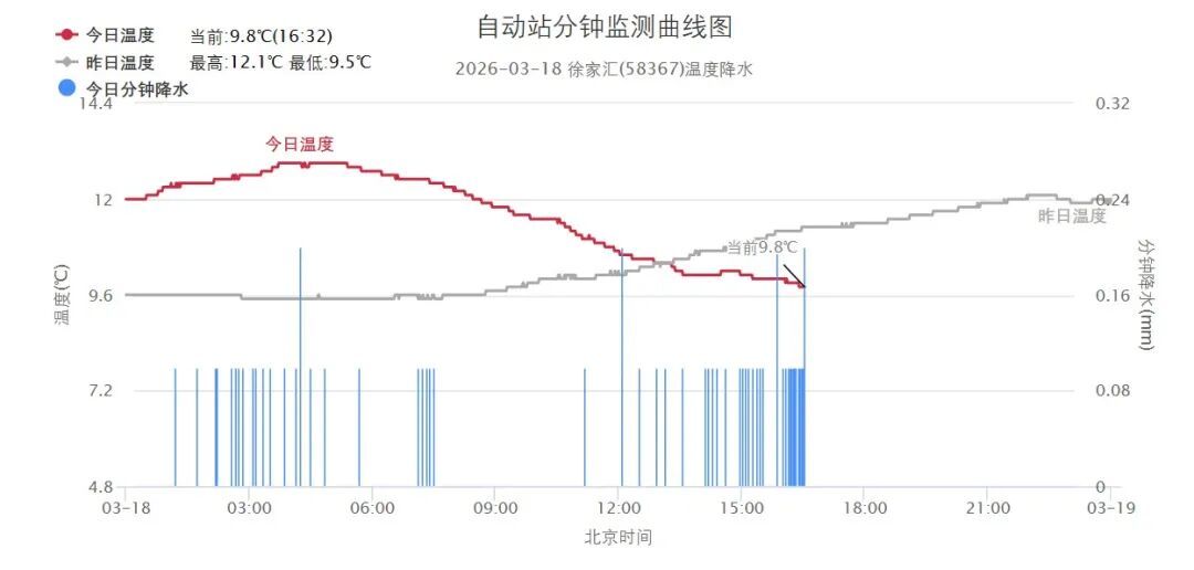今天申城的雨淅淅沥沥下了一整天,午后更明显一些。昨天20时到16时的雨量统计显示,青浦华新镇9.5毫米为最大,市区徐家汇站是7.0毫米。受雨水打压,今天温差较小,徐家汇站白天气温在10.0~12.3℃之间。4~5级的偏北风加上湿度大,今天体感湿冷。