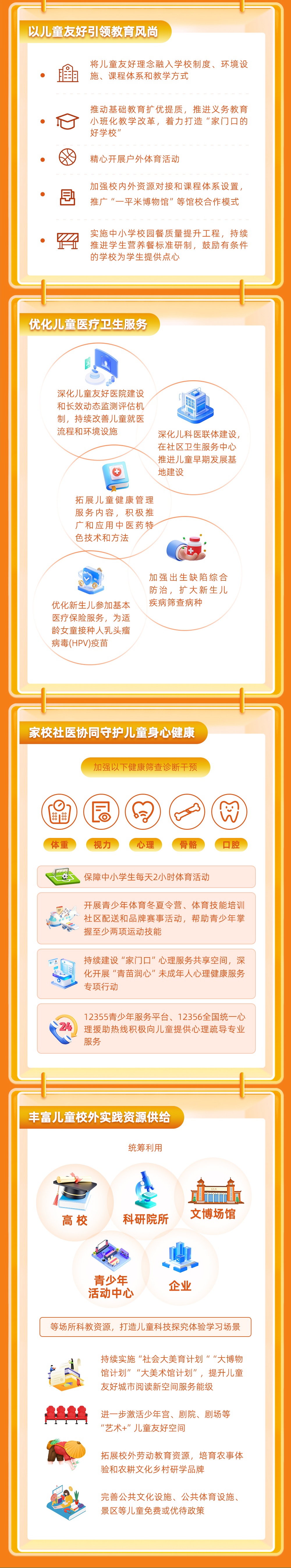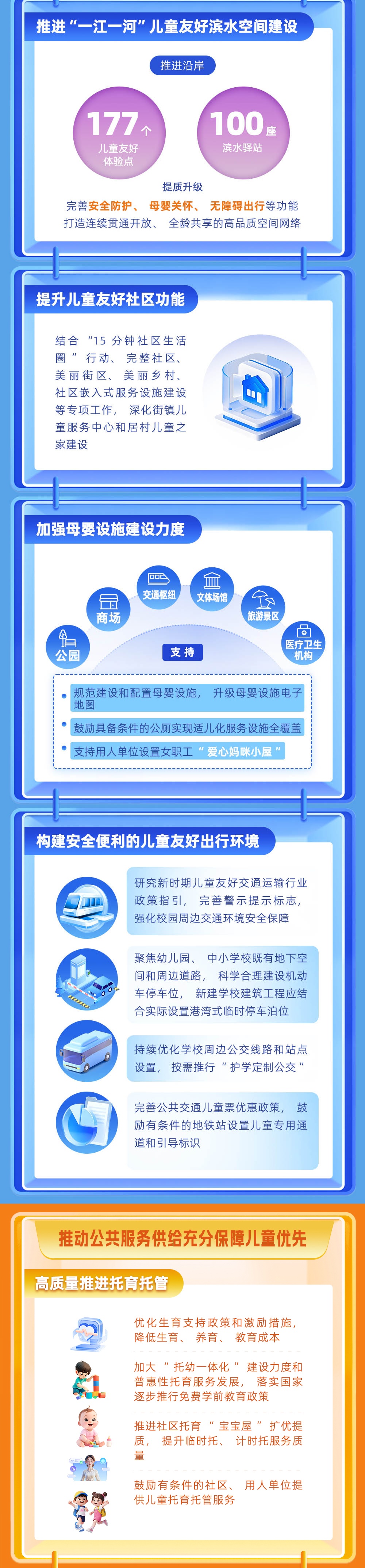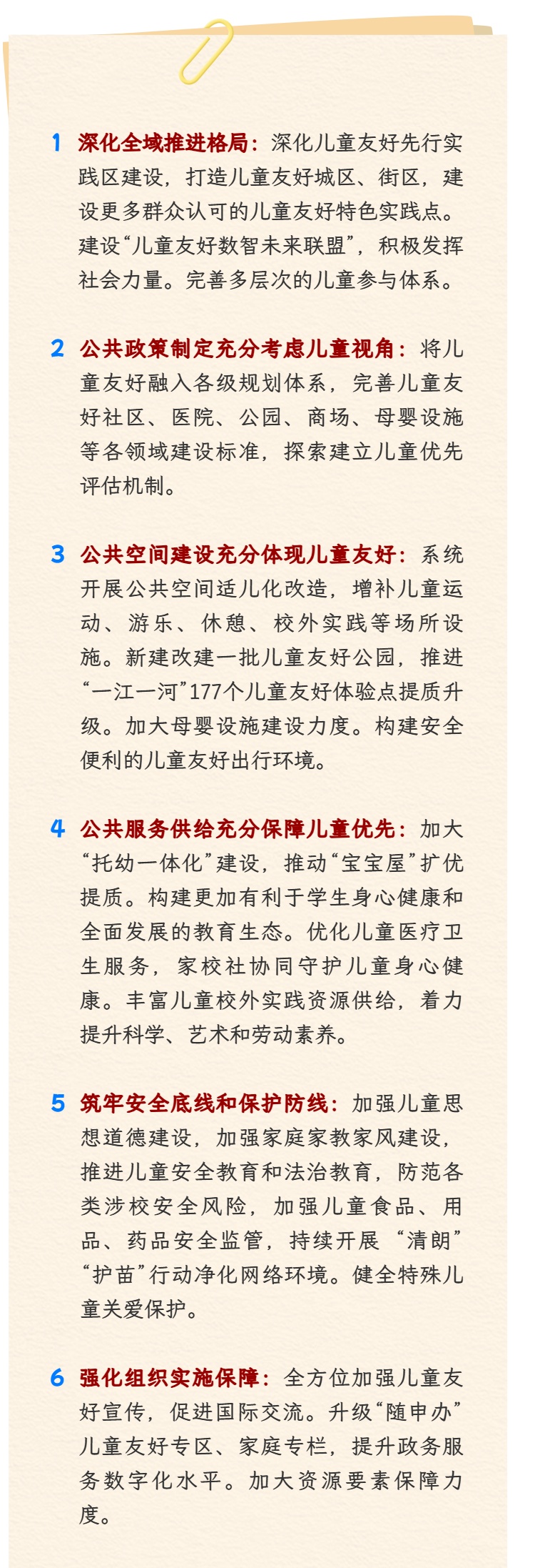 新一轮行动方案强调下一步要深化儿童友好建设全域推进格局,将儿童优先原则落实到公共政策制定、公共空间和设施建设、公共服务供给等方面,筑牢安全底线,守护广大儿童健康安全成长。具体而言,要把儿童友好理念深植城市规划、建设、治理各环节:增补儿童运动、游乐、休憩等场所设施,让孩子们有更多机会“在阳光下跑起来”;加大“托幼一体化”建设力度,让幼有善育更加普惠、可及;持续改善儿童就医流程和环境设施,让看病就医更加舒心;实施“五健”促进行动,家校社协同守护儿童身心健康;推广“一平米博物馆”,让科普教育在孩子们身边落地开花;加强安全教育和宣传、净化网络环境、健全特殊儿童关爱保护,让每一颗童心都得到用心的呵护。一图读懂↓