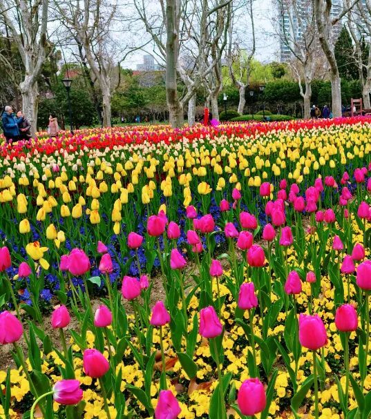 闸北公园的郁金香成片种植,粉、黄、红、白等多种颜色交织在一起,宛如一幅色彩斑斓的春日油画。花海周边绿植环绕,空气清新,让人忍不住放慢脚步,静下心来感受春日的浪漫。此外,公园内的树荫较多,即使是晴天前往,也不会觉得炎热,非常适合老人、小孩一同前往,全家沉浸式感受春日美景。