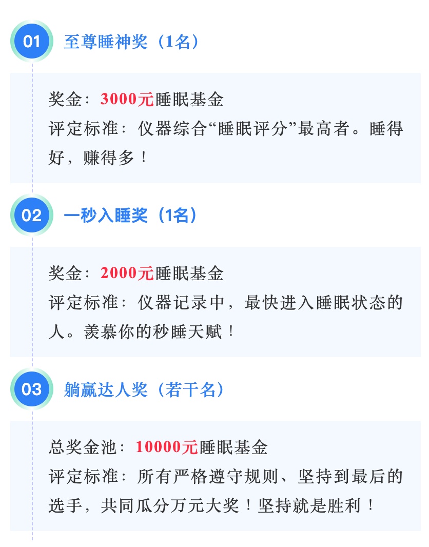 参赛者唯一的KPI是睡到自然醒,睡眠得分最高者将获得3000元奖金,最快进入睡眠状态的人将获得2000元奖金,所有严格遵守规则并坚持到最后的选手共同瓜分万元大奖。主办方将统一提供专业的睡眠监测仪器,选手需要按要求佩戴,奖项评定以仪器记录的客观数据为最终依据。