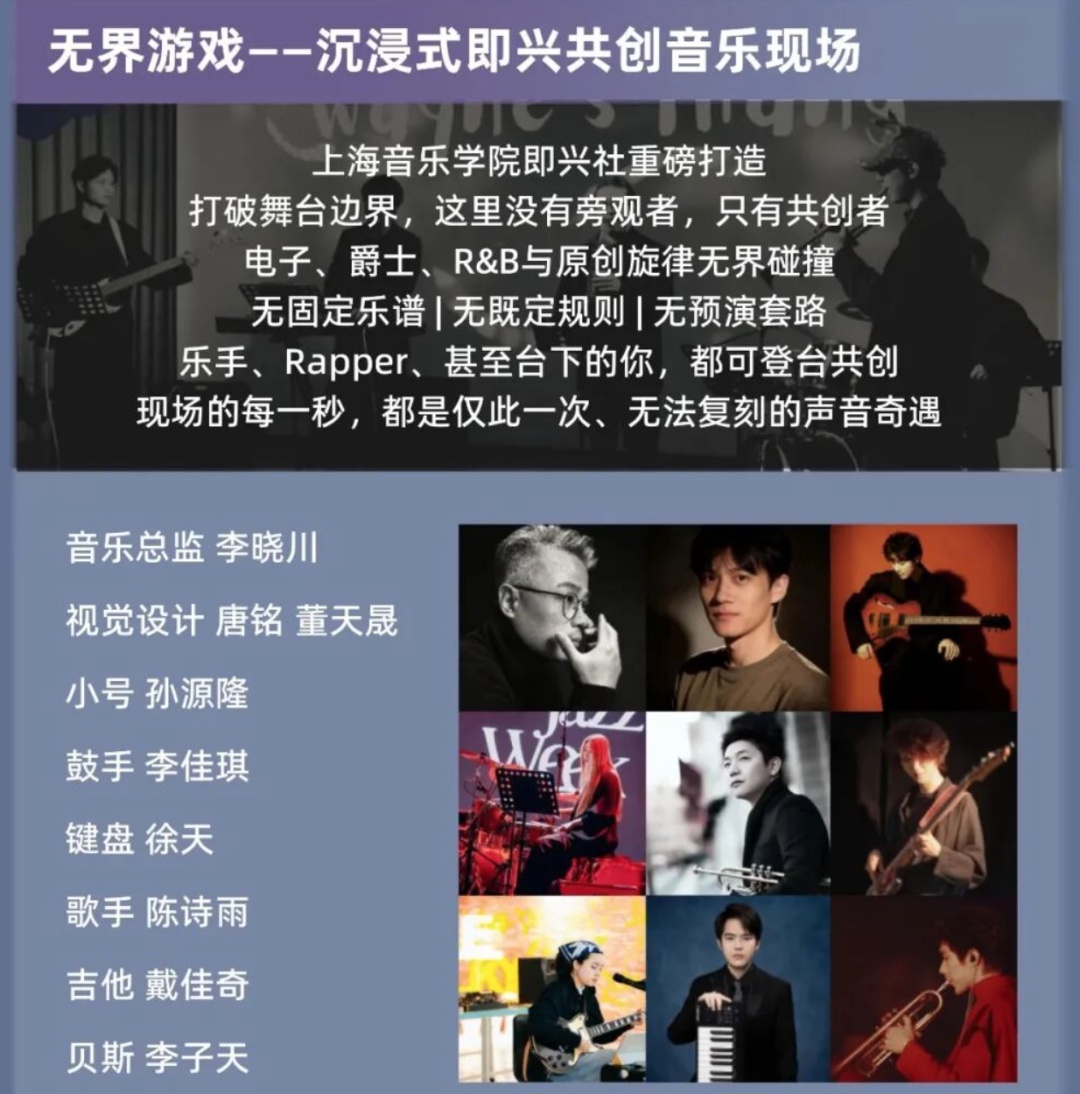 《无界游戏——沉浸式即兴共创音乐现场》是上海音乐学院即兴社打造的全员即兴共创的艺术现场。让音乐回归流动本真,打破舞台与观众的边界。