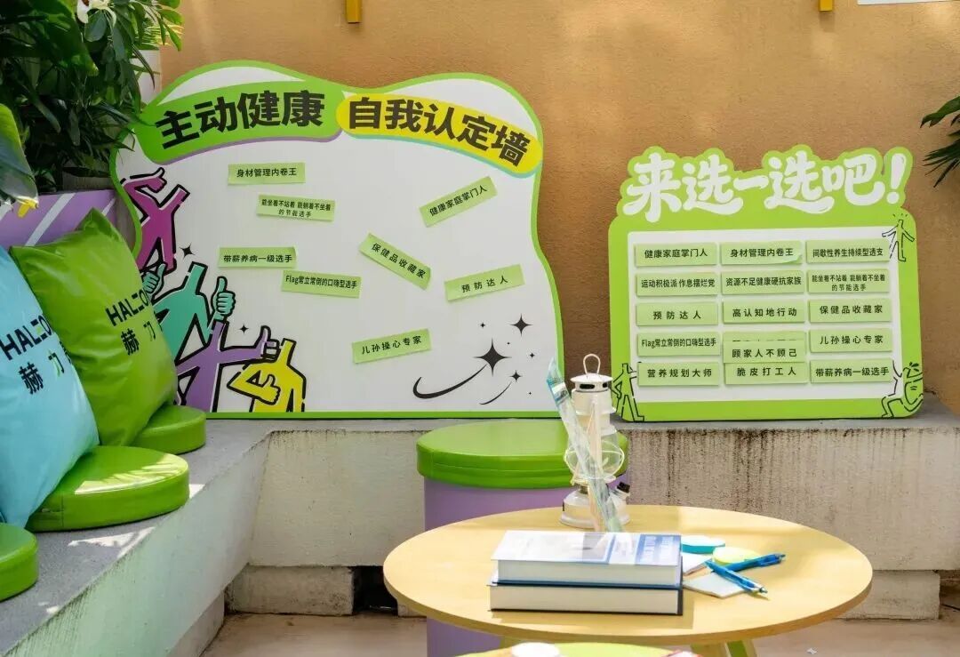 在保留空间爱心加油站原有的骑手友好、爱心药箱、饭菜加热、免费饮水、临时休息等贴心生活服务的基础上,空间不仅提升了颜值,还增加了不少以“健康”为主题的趣味打卡点位。无论是路过的游客,在周边活动的居民、上班族,还是进来休憩的新就业群体,都可以在碎片化的时间中收获一份独特的场景体验感。