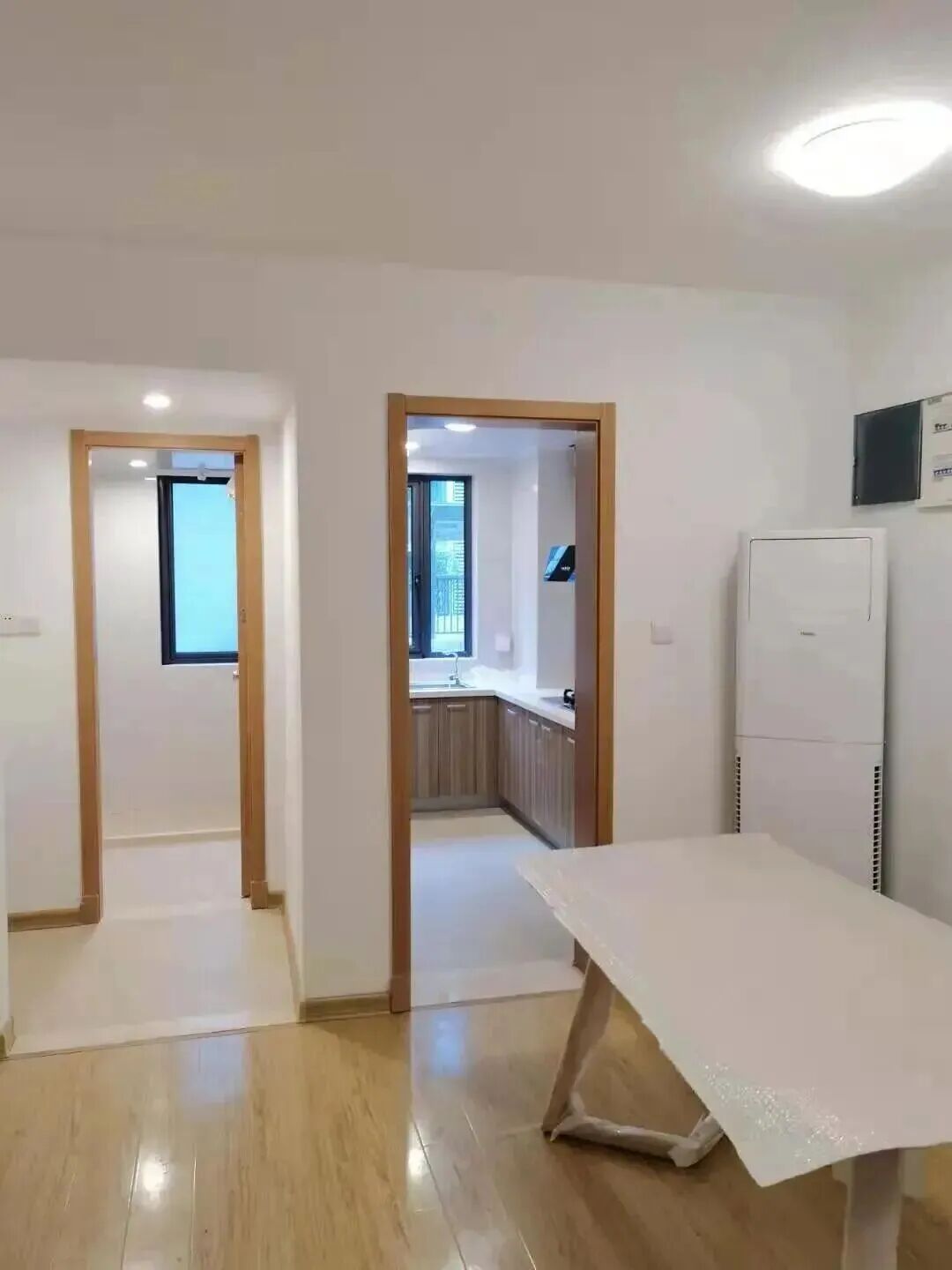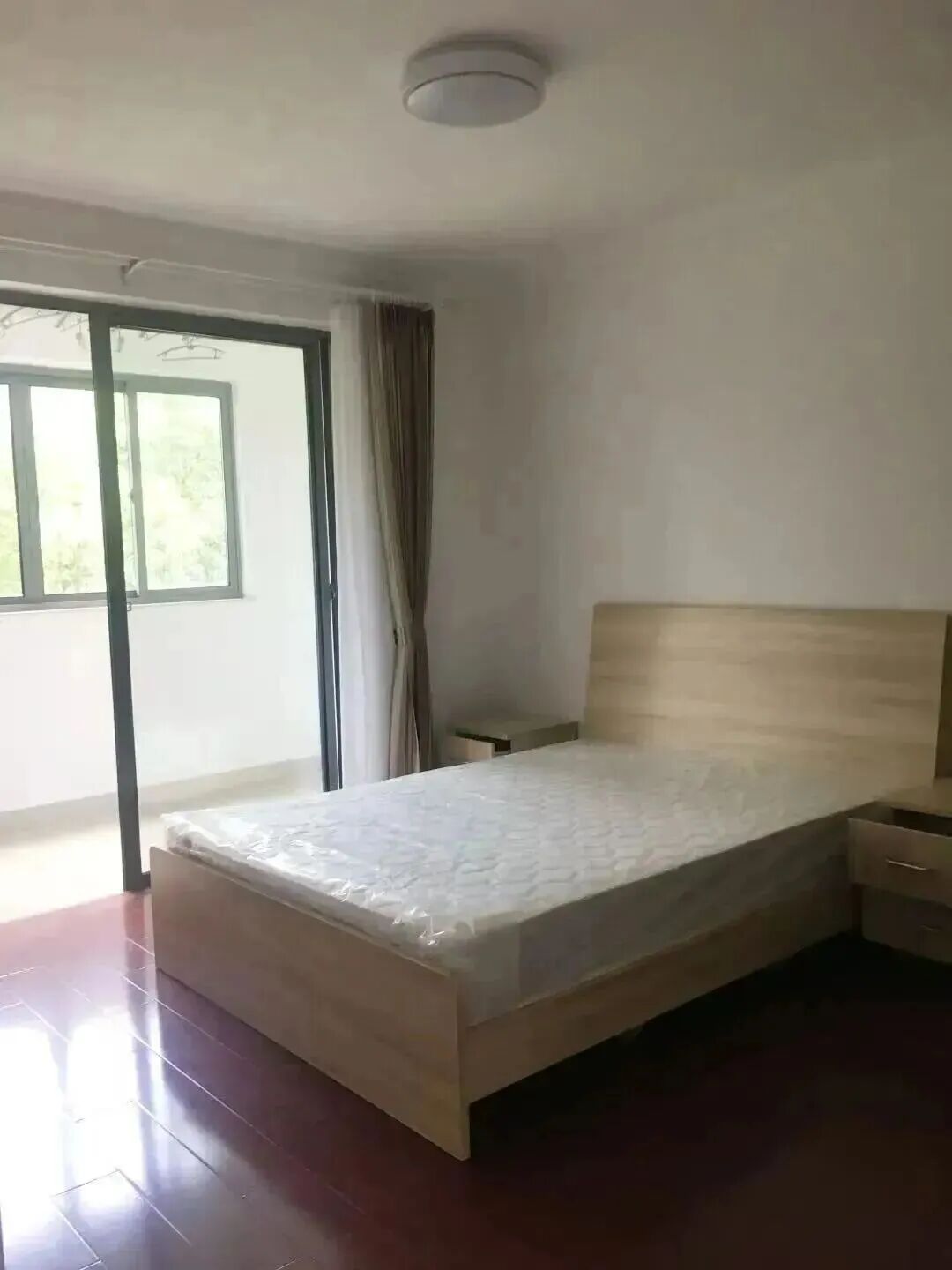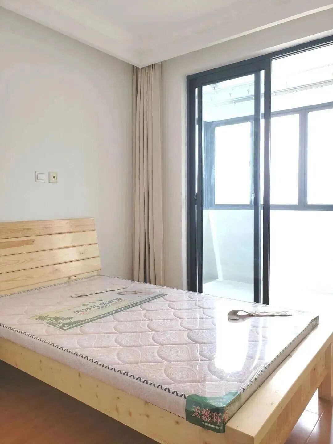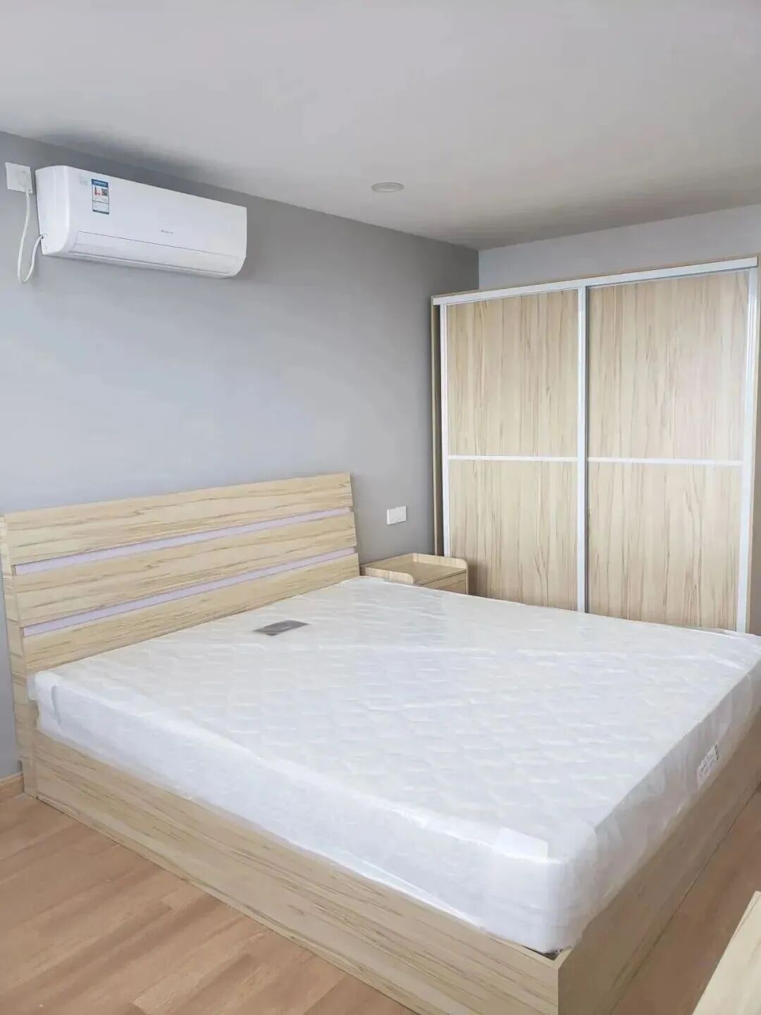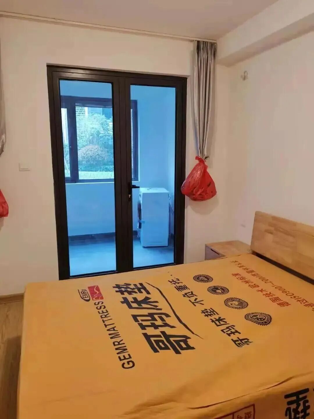【屋内家具有:床,床垫,床头柜,衣柜,餐桌,空调,浴霸,燃气灶,脱排油烟机】