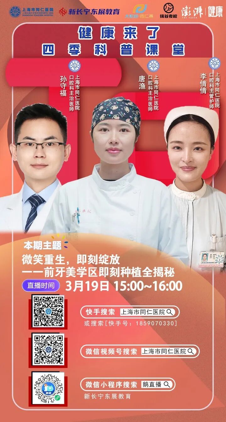 今天(3月19日)15:00—16:00,“上海长宁”App将与上海市同仁医院“大虹桥·同仁荟健康直播”共同直播:前牙美学区即刻种植全揭秘。