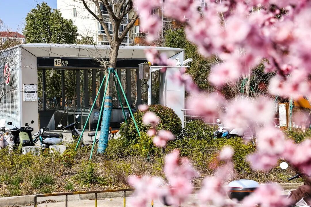 早上8时许,双柏路站外有不少乘客为春景放慢脚步。粉白相间的美人梅在晨光中舒展枝条,花瓣随风轻扬,落英点缀着人行道。赶着上班的李女士举起手机连拍数张:“以前总觉得赏花要去公园,现在地铁站出来就能看到这么美的花,一天的心情都被点亮了。”