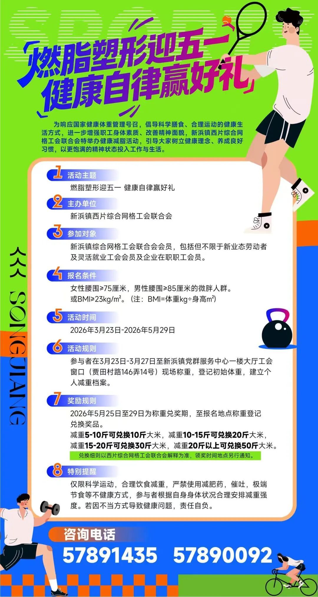 参与者在3月23日--3月27日至新浜镇党群服务中心一楼大厅工会窗口(贾田村路146弄14号)现场称重,登记初始体重,建立个人减重档案。