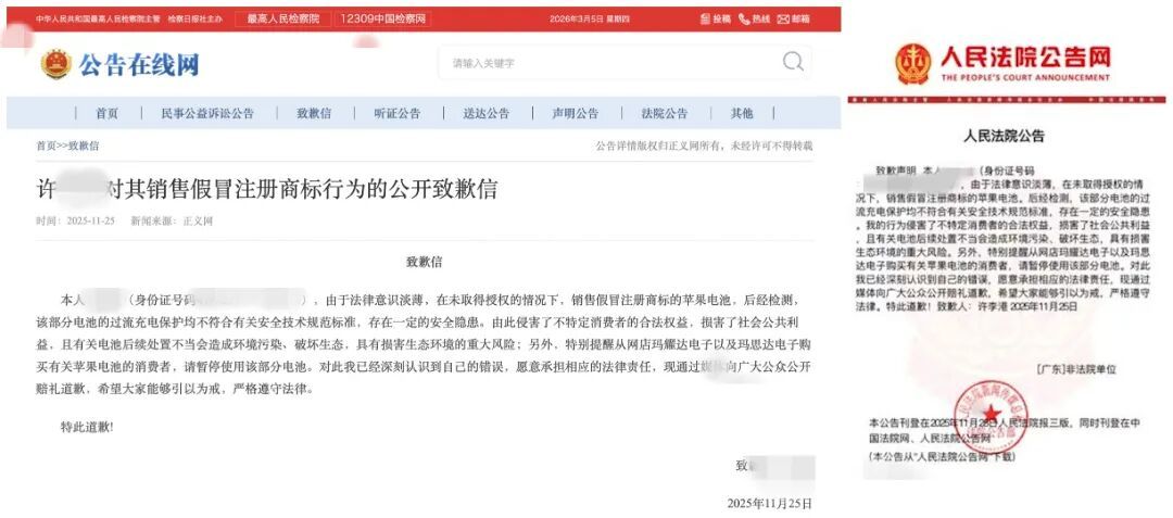 “对此我已经深刻认识到自己的错误……特别提醒从网店玛耀达电子以及玛思达电子购买有关苹果电池的消费者,请暂停使用该部分电池……”11月15日,许某甲等人先后在人民法院报、人民法院网等媒体刊登致歉声明。
