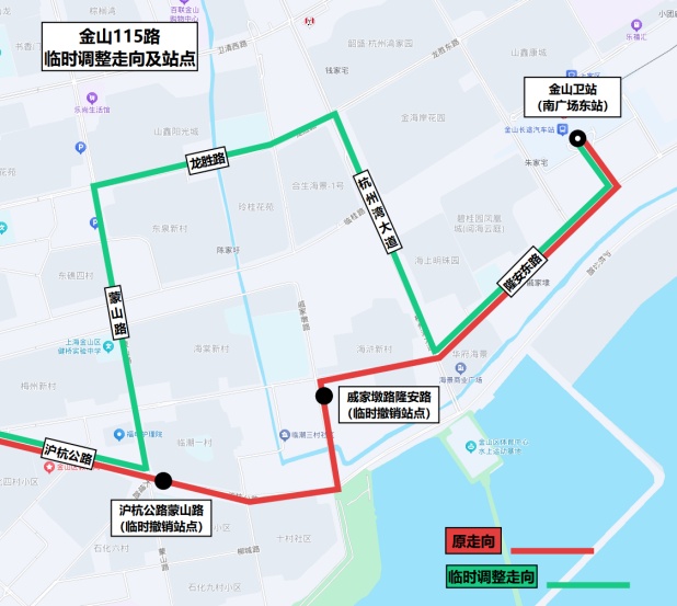 原走向:金山卫站、同凯路、隆安东路、戚家墩路、沪杭公路、大堤路、新城路、金一东路、卫二路、沪杭公路、学府路、松金公路、金张公路、金廊公路、亭枫公路。