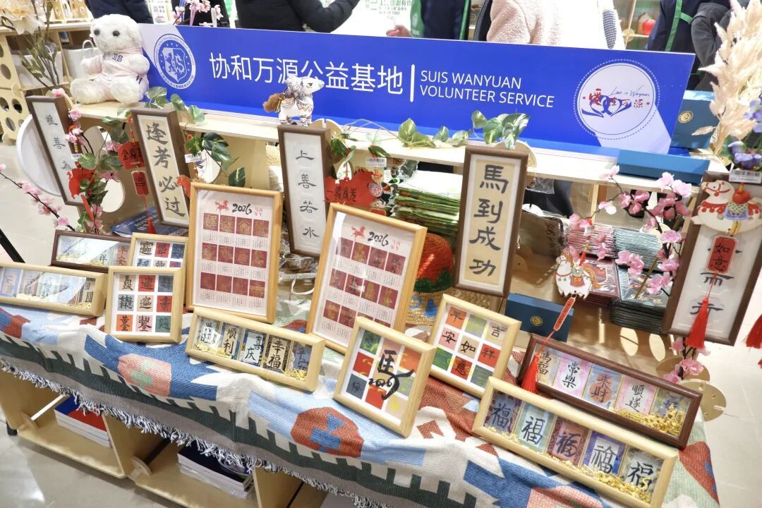 走进超市,最显眼的“C位”便是“协和万源公益基地”展区。这里陈列着学生们亲手设计制作的作品:马年种子纸日历、书法相框、“马布布”布艺挂件……每一件都承载着孩子们的创意与心意。
