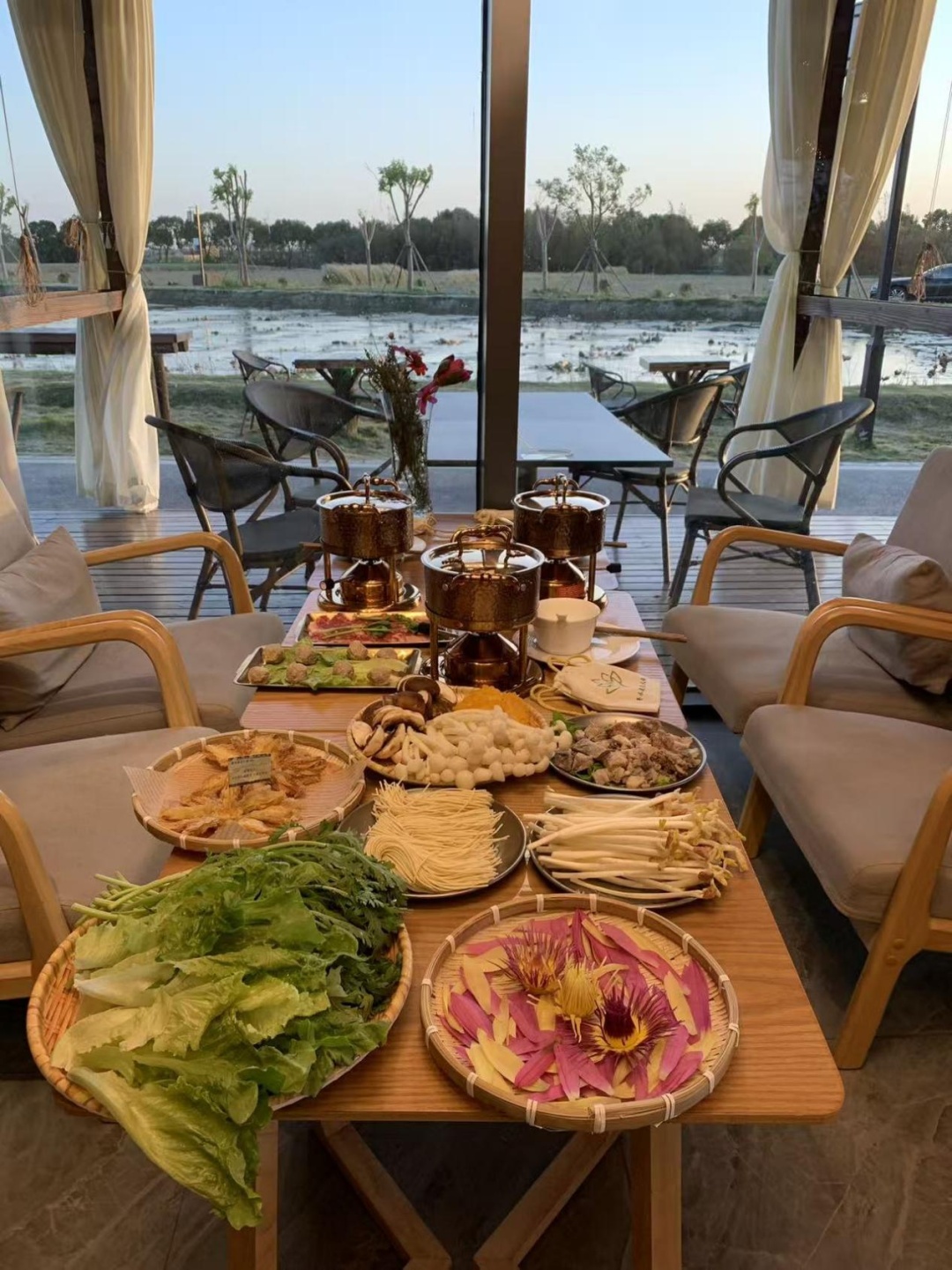 西渡街道·五宅村:离市区更近,半小时即达。气氛清雅,有大片莲花塘,也有开阔林地。林间可以寻宝、可以烧烤,咖啡馆就在林子边上。莲花塘旁那座上下两层的雅致小院,是吃莲花火锅的地方,二楼的窗边正对着整片莲花塘。