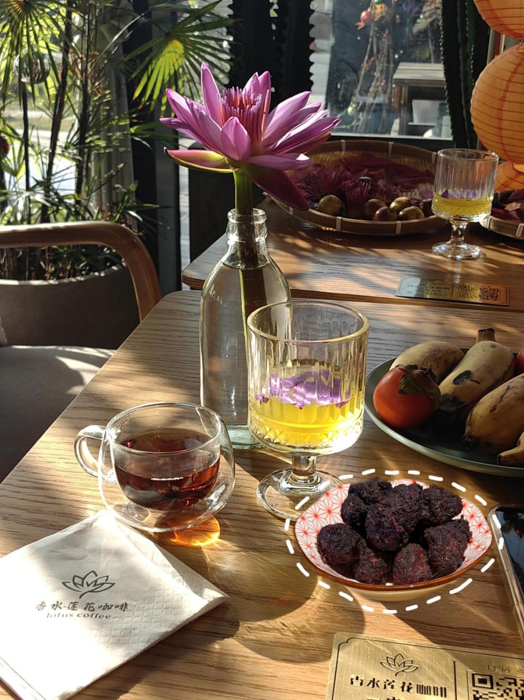 在莲塘边坐下,手边是一杯刚沏的莲花茶,金色的茶汤在阳光下泛着光。抿一口春茶,嚼一颗梅干,太阳晒得人后背发烫,这才是春天该有的样子。