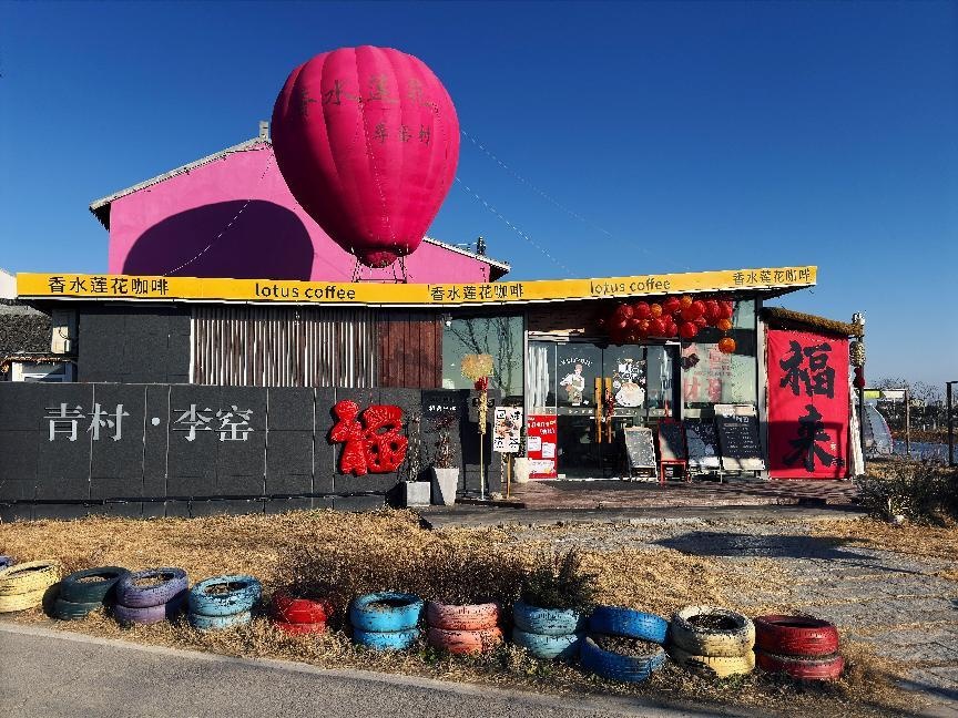 青村镇·李窑村:氛围更热闹。玫红色的咖啡馆门口飘着巨大气球,蒂芙尼蓝的民宿立在村口,黄绿色的农家小院冒着烟火气,粉红色的小房子卖着土产。气球下、屋檐边,那些春节挂上的祝福牌还在,在春风里轻轻晃着,像在跟你说:好彩头一直都在。