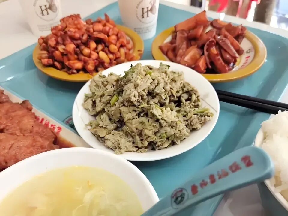 后厨的这份用心,也得到了食客们的认可。窗口前,刚取完餐的居民看了一眼盘中餐,油焖笋配香椿炒蛋,笑意已然藏不住:“春天嘛,就该吃这些。自己在家炒不出这个锅气,食堂火旺,一炒就香。”不远处,几位老人围坐一桌,餐盘里蚕豆碧绿、笋块油亮,“这几样新菜我们天天点,味道好,出菜快,关键是新鲜。”