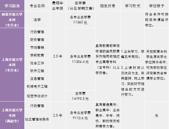 为了一切学习者,一切为了学习者 上海开放大学(Shanghai Open University)是由上海市人民政府举办,经教育部批准成立,由上海市教育委员会管理的新型高等学校。学校前身为上海电视大学,创办于1960年。2012年经教育部批准更名为上海开放大学。学校以现代信息技术为支撑,以远程开放教育为主要形式,面向成人提供非全日制学历教育以及非学历教育等,是上海学习型社会建设和终身教育体系建构的重要承载者。 上海市宝山区业余大学(上海开放大学宝山分校)创建于1981年,是经上海市人民政府批准,由市教委主管、宝山区教育局领导的综合性公办成人高校。曾被评为上海市文明单位、上海开放大学优秀分校。办学40多年以来,学校秉承“为了一切学习者,一切为了学习者”的办学理念,服务地区经济与社会发展,培养了两万余名本、专科毕业生,为推进宝山区终身教育和学习型社会建设作出了贡献。 备注:补修专业课针对跨专业报读专升本专业的学生设置,补修课程学费需按照相应学分另行计算。(专业总学费不包含补修课程费用) 全年滚动招生。 春季入学截止时间:2026年3月31日 秋季入学截止时间:2026年9月中旬 1.报名本、专科学生需持本人身份证、毕业证书原件来校报名。 2.非沪籍学生还需提供在上海市居住或工作的相关证明。 3.报名专升本的学生前置学历为国内的需提供学信网下载的《教育部学历证书电子注册备案表》或认证报告,前置学历为国外的需提供教育部留学服务中心出具的国外高等教育文凭认证书。 报读本、专科报名费均14元。报读上海开放大学专升本还需缴纳入学水平测试费26元/门(两门合计52元)。 宝山区永乐路737号 56126313 56126314 开放教育学生通过资格审核即可注册入学。上海开放大学开放教育本科(专升本)学生还须参加上海开放大学统一组织的入学水平测试。 实行学分制。学校采用线上线下相结合的混合教学模式,以丰富的网上教学资源和优质的直播课程,为学生提供灵活便捷的学习方式。 学校可根据行业、企事业单位对在职在岗人员的培养需求,定制课程模块,从而培养出符合行业、企事业单位需求的应用型专门人才。 形成性考核与终结性考试相结合,按比例合成成绩。 报读开放教育各专业的学生,凡已参加普通本科高校、高等职业学校、开放大学、独立设置成人高等学历教育以及国家自学考试相关课程的学习且考试成绩合格,或已获得相应非学历证书,符合要求可申请免修免考相应课程,实现学分转换。 上海开放大学自2008年起设立“奖助学金”制度,激励和帮助了一批又一批学子顺利完成学业。 1.上海开放大学开放教育本科和开放教育专科:由上海开放大学统一组织考试。 2.国家开放大学开放教育本科:由国家开放大学和上海开放大学统一组织考试。 3.根据课程的教学和考核要求,考试形式有闭卷考和开卷考。考试方式有笔试、口试、论文考试、作品考试、技能考试、上机考试等。 学生修完规定的课程且考核合格(需要补修的学生还需修满补修课学分),达到毕业总学分的要求,思想品德经鉴定符合要求,准予毕业并获得毕业证书。 上海开放大学开放教育本科和开放教育专科毕业证书由上海开放大学颁发。 国家开放大学开放教育本科毕业证书由国家开放大学颁发。 获得学校颁发的毕业证书,国家承认其高等教育相应学历。毕业证书可在教育部学历证书查询网站——中国高等教育学生信息网(http://www.chsi.com.cn)查询。 开放教育本科学生满足学士学位授予条件,可向学校学位评定委员会申请学士学位。 学位证书可在教育部学历证书查询网站——中国高等教育学生信息网(http://www.chsi.com.cn)查询。