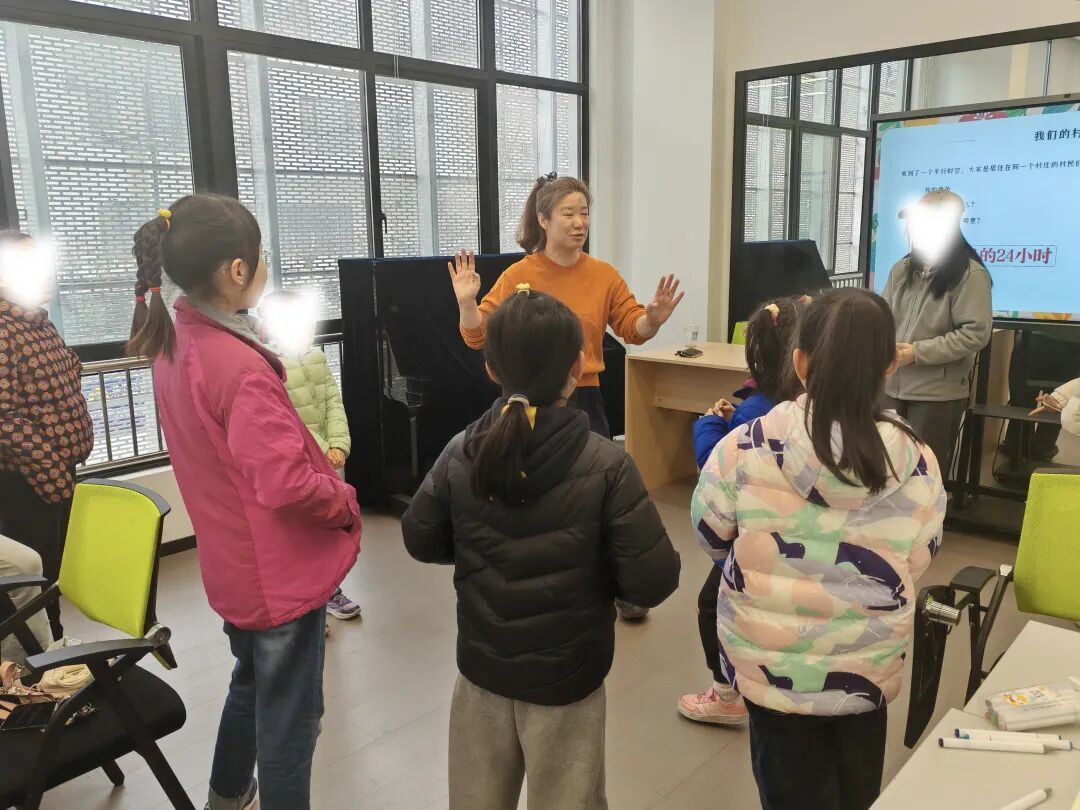 绘画结束后,活动进入分享环节。老师引导孩子们逐一介绍自己的绘画内容,随后以“村庄的24小时”为主题,鼓励孩子们发挥奇思妙想,分享自己在村庄中想要从事的工作。孩子们踊跃发言,脑洞大开,新奇的想法得到了老师的肯定与鼓励。