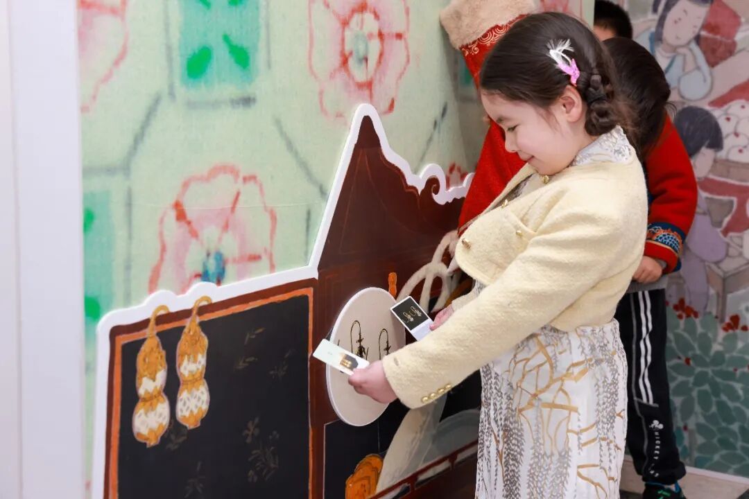 在绘本场景展区,孩子们驻足凝视水墨晕染的画面,在宣纸上的笔墨肌理中感受传统绘画之美;手持互动卡片,在展厅内寻找明清首饰、书房家具、瓷器用具、织绣纹样等馆藏文物的艺术呈现,将卡片与展厅内的图样一一对应,在沉浸式寻宝中认识江南工艺的丰富门类。手工体验区里,孩子们动手创作主人公手作,在实践中加深对传统工艺的理解。