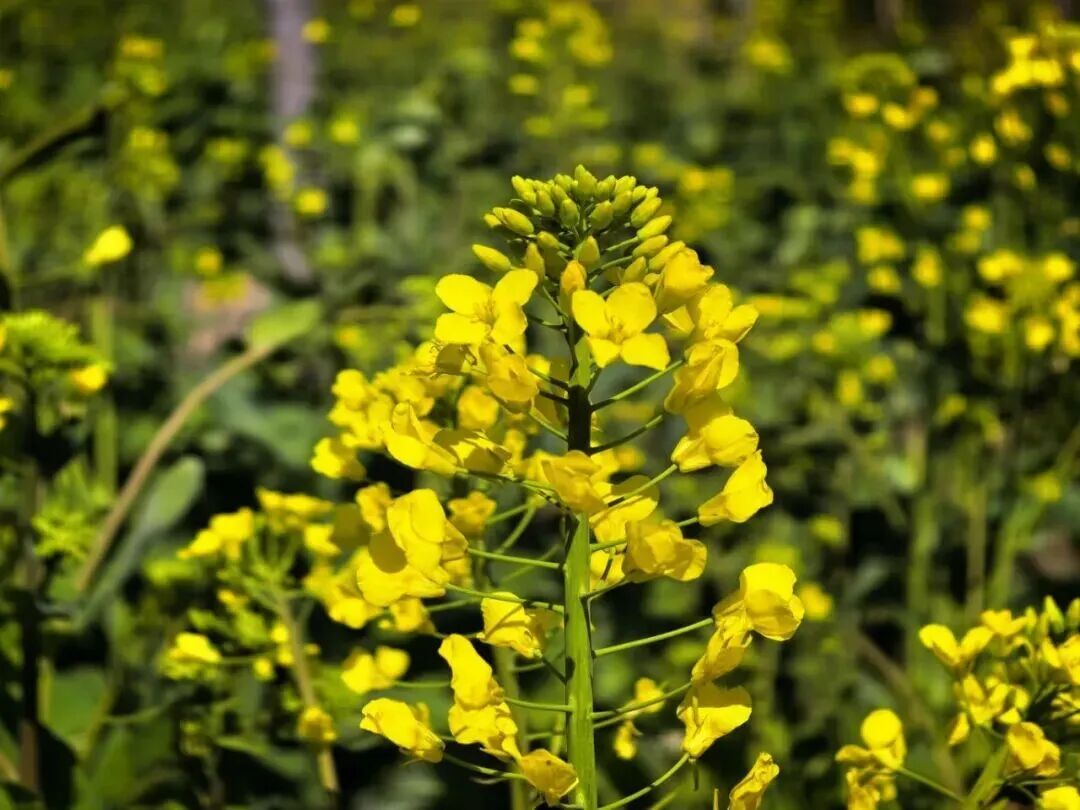 油菜花开时,铺天盖地,金灿灿一片,就像阳光泼洒在大地上。每一朵油菜花极小,四片薄薄的花瓣簇拢合围,千万朵聚在一起,便成了金色的海。风起时,花浪层层涌向远方。