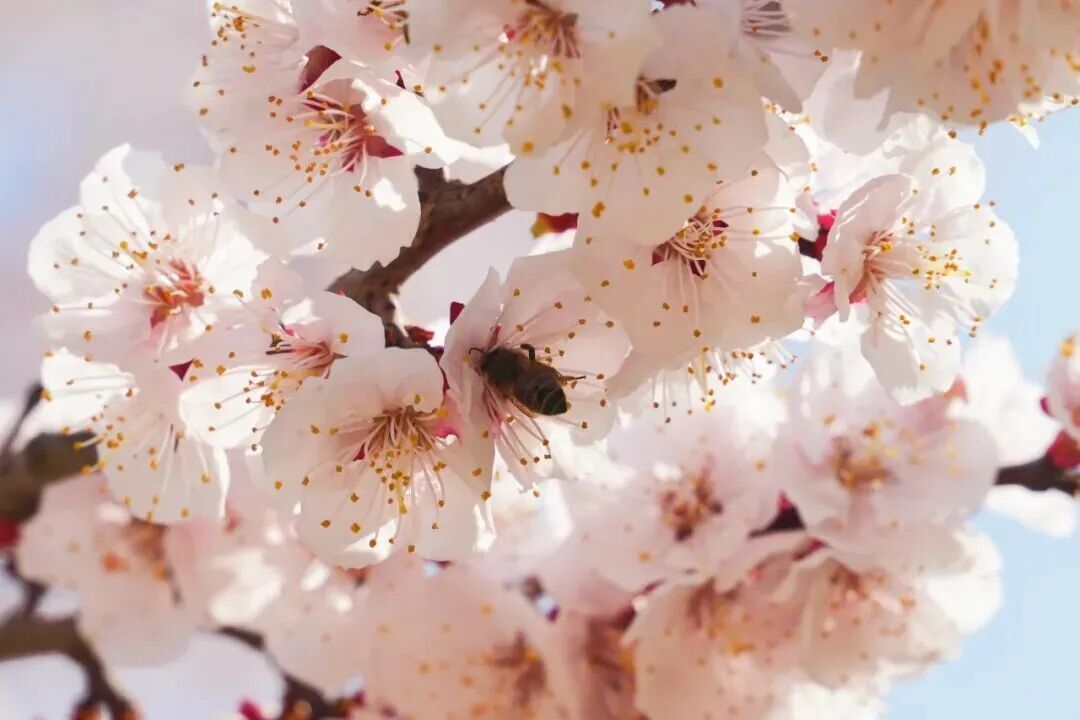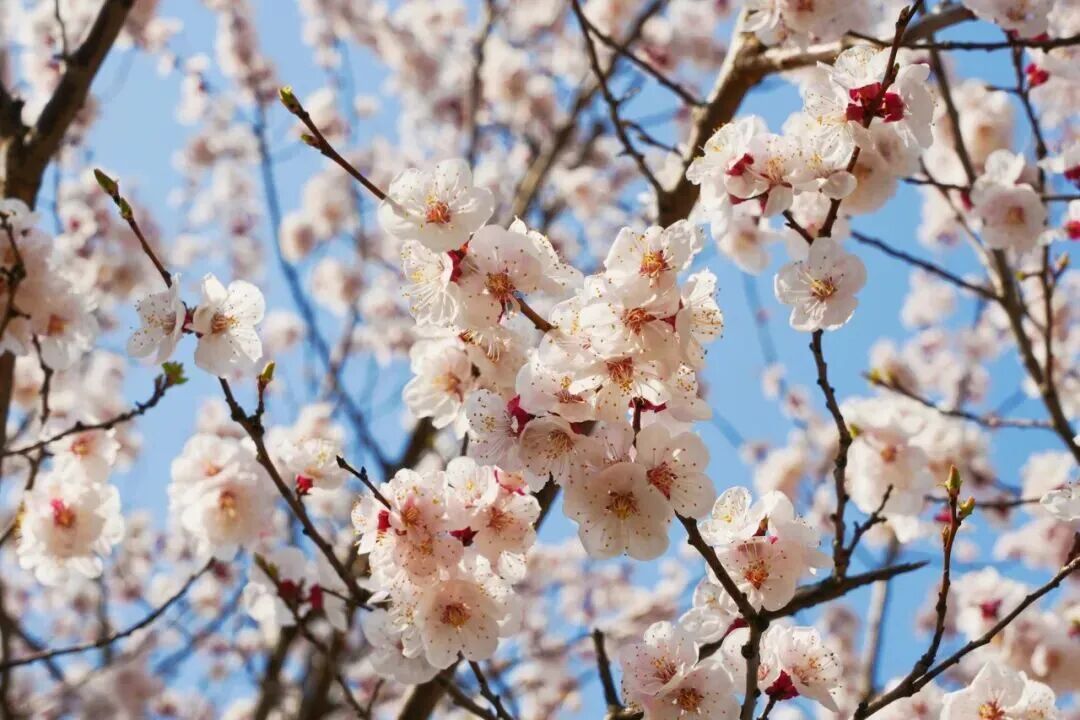杏花是春天最早的信使之一。初开时粉红,盛开后转为白色或带红晕。红萼点点,远远望去,一树杏花红白相间,如同枝上缀着朵朵云霞。