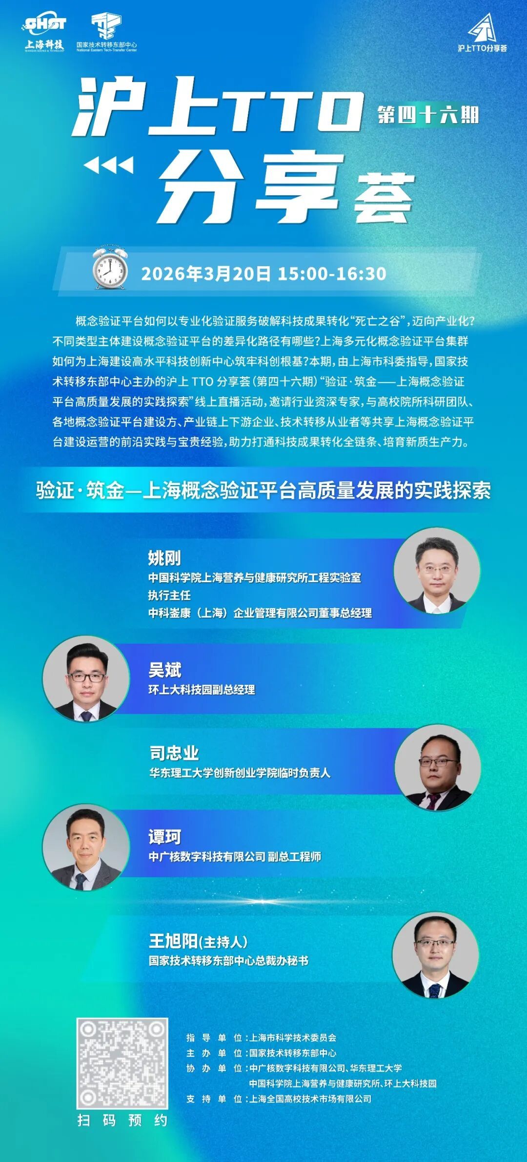 概念验证平台如何以专业化验证服务破解科技成果转化“死亡之谷”,迈向产业化?不同类型主体建设概念验证平台的差异化路径有哪些?上海多元化概念验证平台集群如何为上海建设高水平科技创新中心筑牢科创根基?3月20日下午15:00,国家技术转移东部中心将主办沪上 TTO 分享荟(第四十六期)“验证·筑金——上海概念验证平台高质量发展的实践探索”线上直播活动,邀请行业资深专家,与高校院所科研团队、各地概念验证平台建设方、产业链上下游企业、技术转移从业者等共享上海概念验证平台建设运营的前沿实践与宝贵经验,助力打通科技成果转化全链条,培育新质生产力。