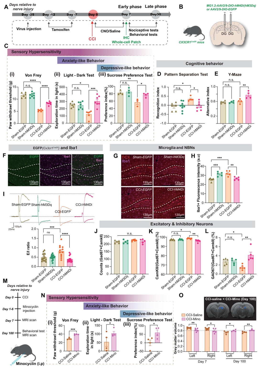 但是,若单纯损毁齿状回结构,会使其丧失对海马脑区的正常支持功能。那么,是否存在更优的干预方法?团队进一步开展机制性研究发现,干预齿状回结构中的一种免疫细胞——小胶质细胞,是阻断慢性疼痛向情绪障碍转变的更优靶点,既能阻断情绪障碍,又不影响海马脑区正常功能,甚至在一定程度上维持认知功能的提升。