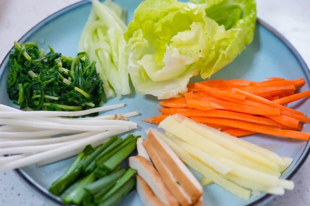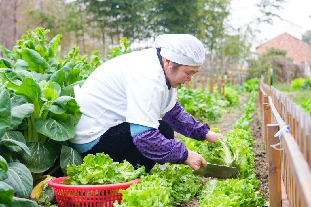 走进“椿萱庭”后院的小菜园,各类应季蔬菜长势喜人、鲜嫩欲滴。工作人员钱琴妹正忙着采摘制作春饼的新鲜食材,她笑着说道:“春饼里包的都是春天刚冒头的时令鲜菜,马兰头、韭菜、胡萝卜等,样样新鲜,吃着对老人身体也好。”