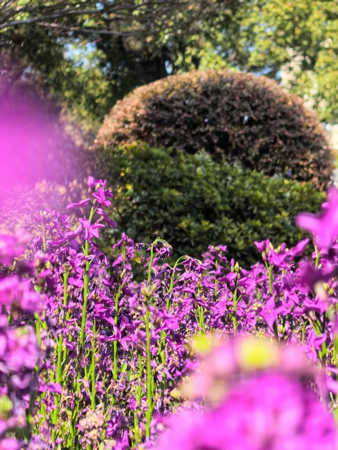 行至金沙江路真光路路口,眼前忽现一片斑斓,紫罗兰正值盛花期。