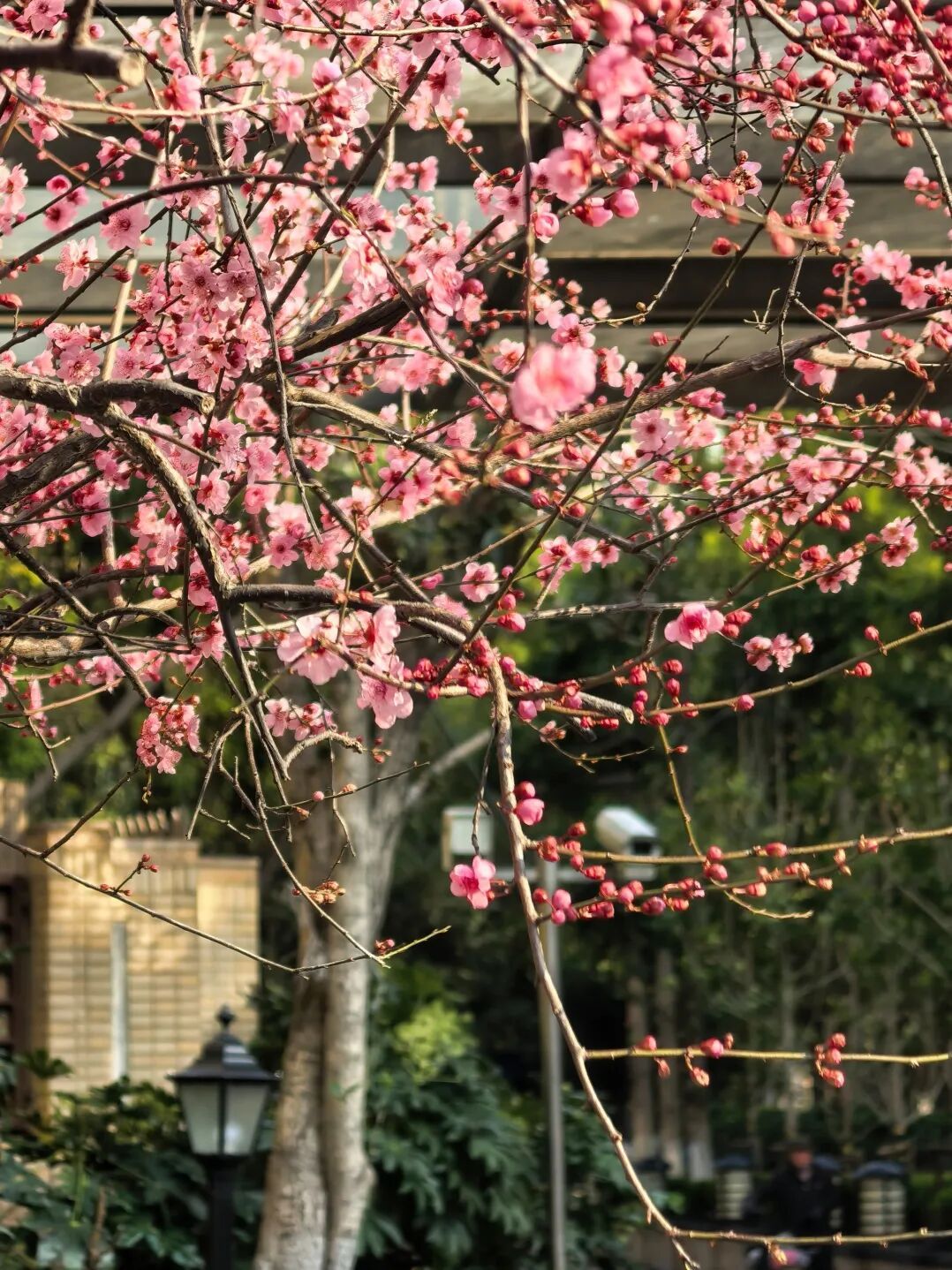 “江南无所有,聊赠一枝春”,未来街区路边的梅花正傲然绽放,远远望去,像是谁把粉色的轻烟系在了枝头。