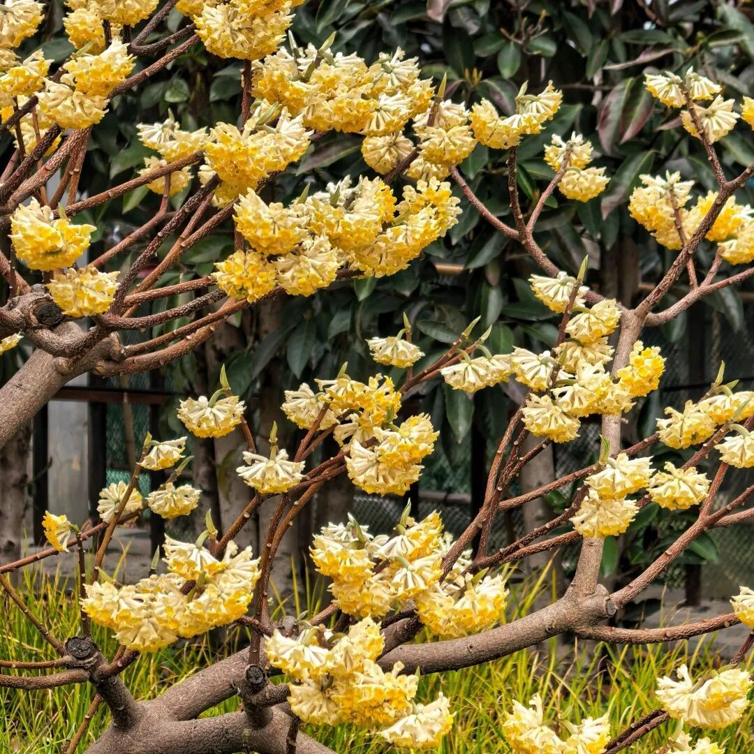 路旁灌木丛中,金黄色的花朵如繁星点点,簇拥枝头,这便是结香。先花后叶,姿态优雅,花朵低垂,如小小铃铛。