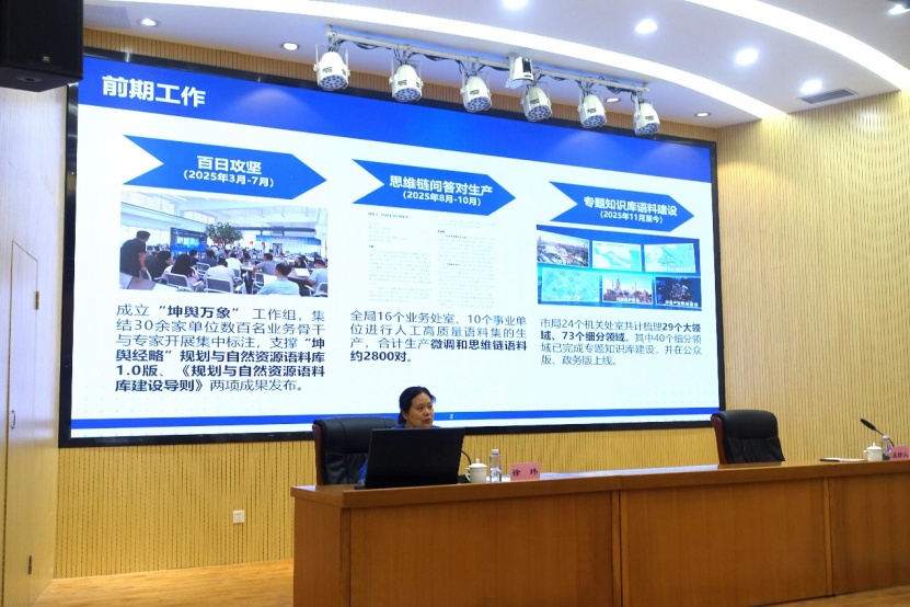 市数城中心副主任徐玮围绕知识库建设主要作用、核心环节等内容进行了介绍。一是“体系构建”重在知识领域全覆盖。强调各单位要立足职能定位,系统梳理、多方共建覆盖全局系统的知识架构。二是“材料收集”重在模型语料高质量投喂。各单位应围绕知识架构精准归集多模态材料,并严把质量关口与数据安全。三是“语料生产”重在高效自动。依托语料管理平台实现材料的便捷上传、自动化加工与入库,提高从材料到语料的转化效率。四是“测试调优”重在实战实操。在模型内测与错题分析工作中,各单位语料专班人员与技术团队集中攻关、深度协同,培养一支既懂业务、又懂技术的FDE骨干队伍。五是“动态扩容”重在长效可持续。通过App使用中的及时反馈以及与业务工作的实时联动,推动知识库始终与规划资源工作同频共振。