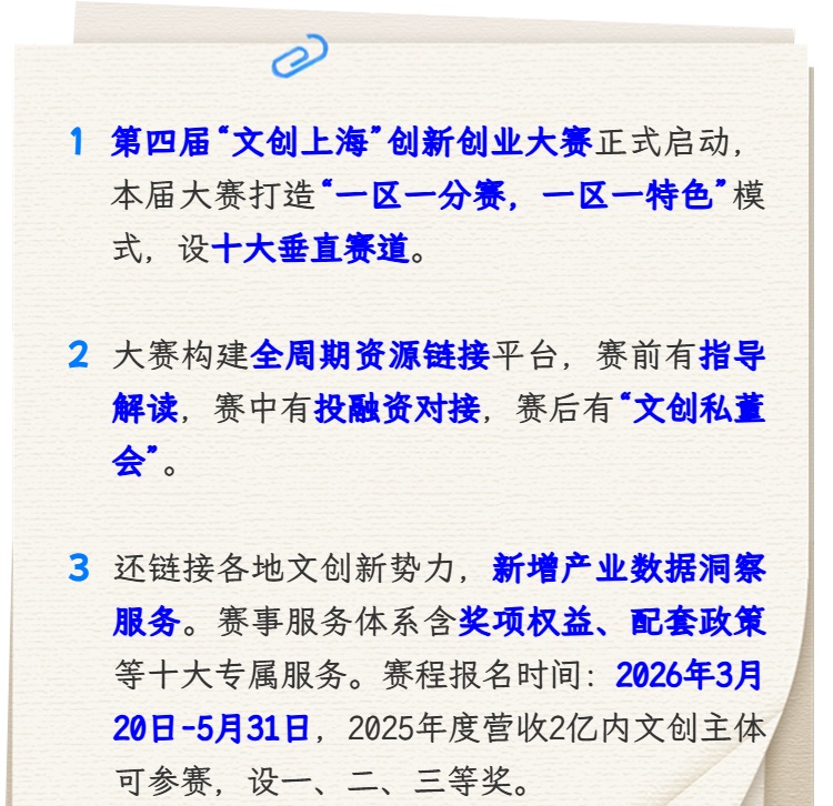 市文化创意产业促进会介绍,由市文创办主办的第四届“文创上海”创新创业大赛正式启动。本届大赛延续“创新奔涌 踏浪生花”主题,自2023年首届赛事举办以来,“文创上海”创新创业大赛已累计吸引3200余家企业报名,挖掘出一批行业优质企业。 点击“划重点”极速浏览↓↓↓ PART 01 赛道焕新 十大垂直赛道落地各区 一区一特色锚定产业风口 相较于往届“3+1”的赛道设置,本届大赛以“破圈融合”为核心理念,联合各区深度参与,打造“一区一分赛,一区一特色”创新模式。围绕各区重点产业方向设置十大垂直赛道,实现赛道定位与区域产业优势精准契合,让每个赛道都有专属的产业资源支撑、政策配套保障,通过专题路演、政策解读、项目对接等活动,实现“赛道设置与区域定位同频、项目遴选与区级需求共振”。 具体而言,“原创IP运营+”由长宁区承办,重点关注原创IP全链条运营与价值转化;“文创赋能时尚消费品+”由静安区承办,主要聚焦国潮新消费,以科技赋能文创研发;“音乐创新+”由虹口区承办,着重探索音乐与多元业态跨界融合;“互联网优质内容创作+”由杨浦区承办,侧重鼓励网络精品内容开发及国际传播;“游戏开发+”由徐汇区承办,重点围绕全终端游戏创新及AI赋能;“影视创制+”由松江区承办,倡导在传统影视模式基础上融合运用AI生成、虚拟拍摄等前沿技术的创新探索;“数字文化出海+”由临港新片区承办,着力助推数字文化贸易与中华文化IP全球化;“数字广告+”由普陀区承办,着重促进AI、大数据与广告技术融合;“文化演艺+”由黄浦区承办,致力推动以突破性创新重塑演艺产业边界;“智能未来+”赛道则定向聚焦人工智能与数字文创深度融合。 PART 02 服务升级 构建产业活动赋能体系 形成赛事全周期闭环赋能 本届大赛构建覆盖赛前、赛中、赛后全周期的资源链接平台,为参赛项目提供全链条、常态化、可持续的发展支持。 第三届赛事推介会回顾 赛前,各区赛道将针对性开展分赛道报名指导、配套政策深度解读及产业环境实地宣介,帮助企业精准把握落地契机,同时合作“数龙杯”全球AI创新大赛等赛事,并计划在北京、浙江、江苏、成都、广州、深圳等全国文创高地同步开展跨地域赛事联动,实现跨区域资源互通与赛事宣介;赛中,依托“文创上海”创投汇,联动投资机构、文化产业基金及银行等金融机构,通过项目路演、资本问诊的形式,为各赛道参赛项目提供专场一对一的投融资深度对接;赛后,开展“文创私董会”,围绕获奖企业核心发展需求,汇聚上下游企业及潜在合作方,深度链接市场资源,为项目打造从精准落地、资本助力到产业深化的完整服务闭环。获奖企业还将享受政策申报、人才补贴、落地孵化、成果展示等十大专属服务,获得全维度发展赋能。 PART 03 资源升级 链接各地文创新势力 构建产业资源深度联动生态 本届大赛深度嵌入区域产业发展脉络,立足本市,为项目提供产业落地、产业链对接的本地支撑;面向全国,联动长三角及全国文创高地,通过联合推介、分赛点直推等模式,为项目拓展全国市场搭建桥梁;放眼海外,引入海外先进技术与创意资源,助力参赛项目接轨国际视野。 此外,本届大赛还新增产业数据洞察专属服务。上海文化创意产业研究院通过对参赛项目深度分析,形成《上海文创产业创新创业趋势报告》,剖析产业发展动态、创新热点与区域活力,前瞻预测未来风向,为政府决策、园区布局、资本投向及企业创新发展提供指引性参考。 PART 04 赛事服务体系 联合大赛合作伙伴资源,聚焦赛道覆盖行业及产业,围绕创新创业主题及企业需求展开系列配套活动,具体包括: 01 奖项权益 公布获奖名单,颁发赛事奖金、奖杯及荣誉证书;本次大赛与“海聚英才”全球创新创业大赛建立赛事联动机制,对符合条件的参赛企业,实施“直通推荐”政策,深度链接“海聚英才”大赛。 02 配套政策 在符合政策条件的基础上,优先推荐获奖企业参加上海市文创资金、创业担保贷款等申报,获得贷款贴息等扶持。同步链接各区产业服务相关部门为企业提供区级文创产业扶持政策申报辅导。 03 孵化培育 对符合条件的获奖企业推荐至各区、头部企业、场地方进行落地合作,通过开展项目对接会、产业交流活动等帮助对接投资方、上下游产业链及相关合作伙伴。 04 人才服务 对符合条件的获奖企业内的优秀人才,优先推荐申请人才补贴,享受落户政策。 05 成果展示 优先参与大赛专题传播计划,获得媒体报道及平台宣发支持,同时,推荐参与长三角文博会、深圳文博会、世界人工智能大会等展会,以及上海设计100+、品牌100+、时尚100+等评选活动,拓展市场推广渠道。 06 落地入驻 获奖者可享受各区落地孵化支持(租金补贴、共享空间等),同时入驻德必集团设立的“文创上海”创新创业孵化基地,可额外享受办公空间减免政策。 07 金融服务 为获奖项目提供专属文创金融产品支持,提供一对一投融资对接、创业孵化等优先扶持服务。 08 路演服务 获奖项目可优先参与“文创上海”常态化路演活动,享受区级项目扶持计划,展示推广、品牌宣传、资源对接等综合性服务支持。 09 创客空间 依托“幻空间”等创业孵化基地,面向创业团队提供创业辅导、项目孵化、同业交流等配套服务。 10 协会服务 获奖企业自动加入上海市文化创意产业