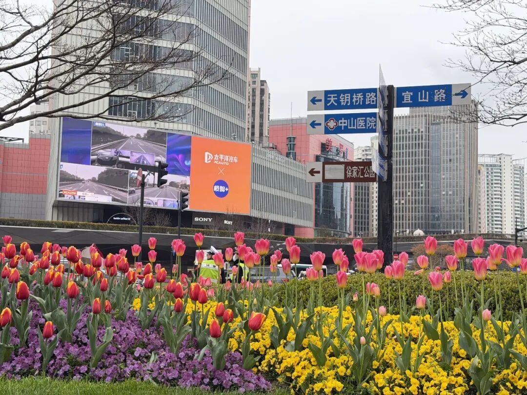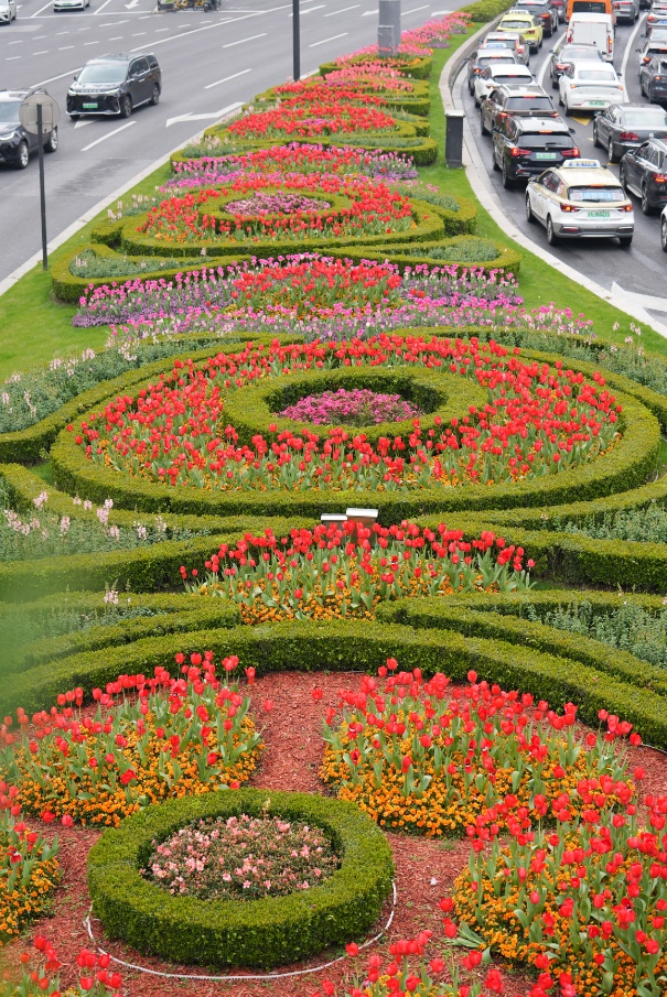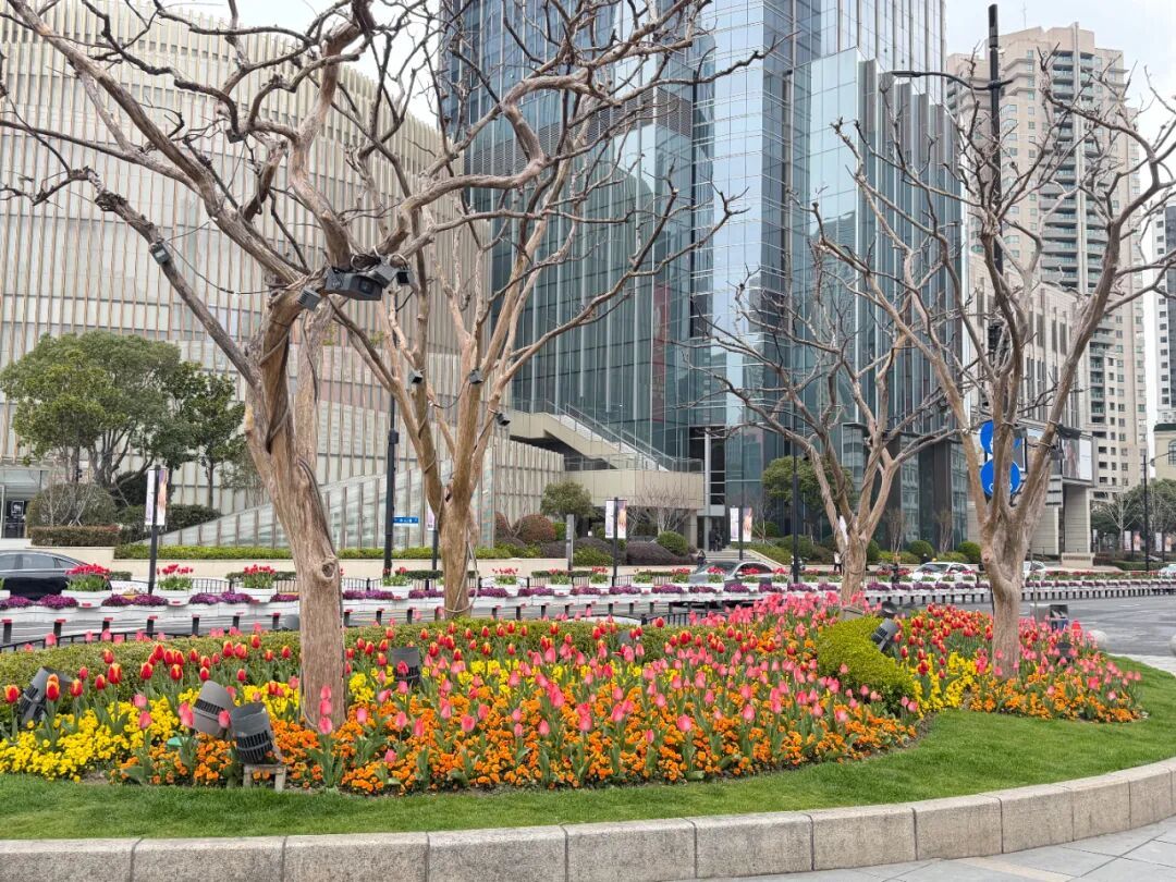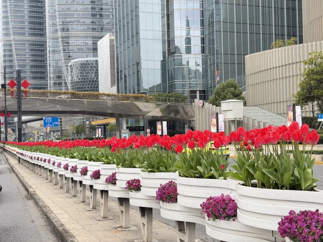 在肇嘉浜路沿线的长岛绿地,炽烈如火的“人见人爱”和“苏红”郁金香,与簇拥其旁的紫色角堇巧妙搭配,在绿地上勾勒出一个又一个浪漫的心形图案。而在太平洋百货门前以及不远处的小平桥绿地,氛围则变得温柔许多,粉白色的“头等舱”与橙黄色的“塞内特”郁金香优雅绽放,为时尚的都市街区平添了一抹梦幻色彩,让匆匆而过的行人也能收获一份早春的愉悦。