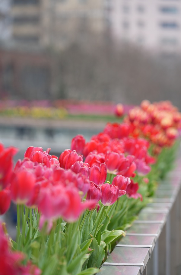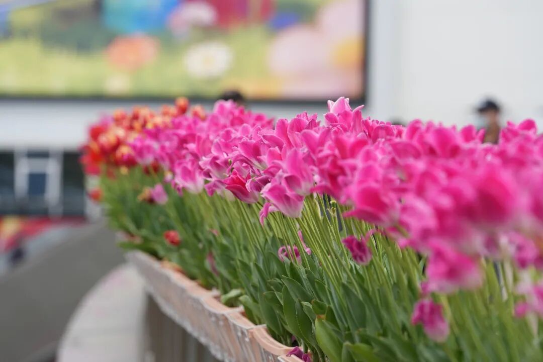 人行天桥上的郁金香吸引路人打卡