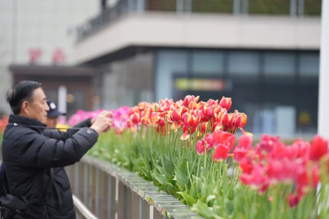 人行天桥上,各色郁金香盆栽衔接而成一条条绚丽的色带,吸引了不少市民特意驻足拍照,将这份独特的城市春色“装”进手机。一位与朋友同游的市民表示,最近天气转好,特意出来逛逛,“听说这里的花好看,所以我们专程来拍照。”从外区前来“兜一圈”的老年市民更是感慨:“我们老年人,待在小区里多,现在到外面来看看,觉得特别开心,心情舒畅。”一位外地游客也赞叹道:“这里郁金香的颜色很多,品种也多,有些以前都没见过。”