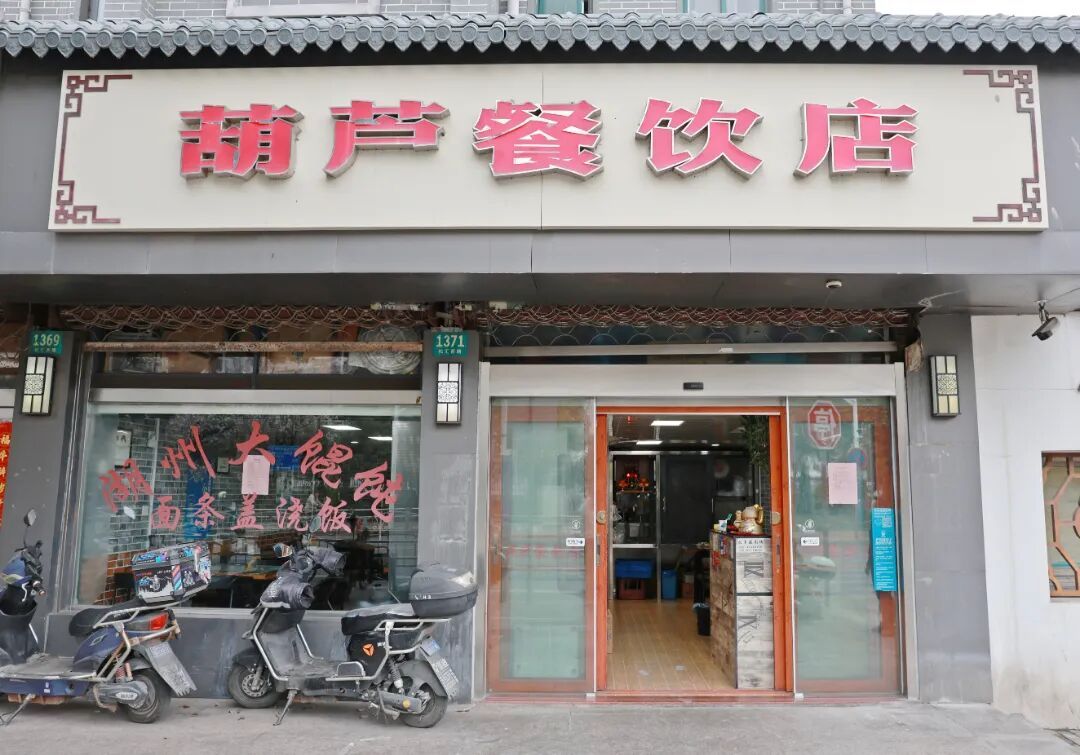 仓城五村入口拐角,松汇西路1371号,葫芦餐饮店的门头上,五个红字漆得发亮,衬着淡黄底板,远远就能瞧见。玻璃窗上贴着“湖州大馄饨”,路过时总忍不住往里张望一眼。